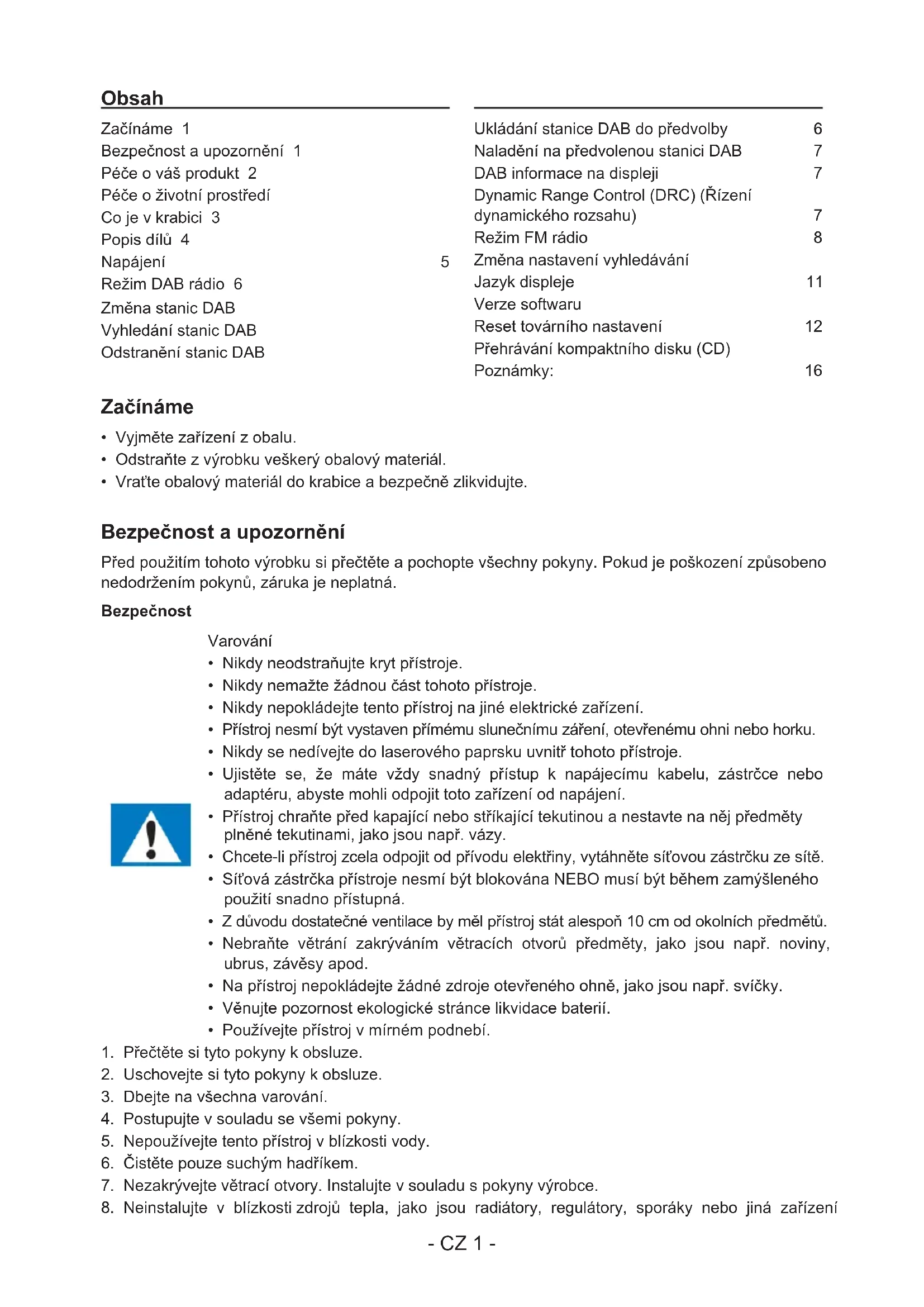 Začínáme 1 Bezpečnost a upozornění 1 Péče o váš produkt 2 Péče o životní prostředí 2 Co je v krabici 3 Popis dílů 4 Napájení 5 Režim DAB rádio 6 Změna stanic DAB 6 Vyhledání stanic DAB 6 Odstranění stanic DAB 6 Ukládání stanice DAB do předvolby 6 Naladění na předvolenou stanici DAB 7 DAB informace na displeji 7 Dynamic Range Control (DRC) (Řízení dynamického rozsahu) 7 Režim FM rádio 8 Změna nastavení vyhledávání 8 Jazyk displeje 11 Verze softwaru 11 Reset továrního nastavení 12 Přehrávání kompaktního disku (CD) 12 Poznámky: 16 Obsah- CZ 2 - produkující teplo (včetně audio zesilovačů).