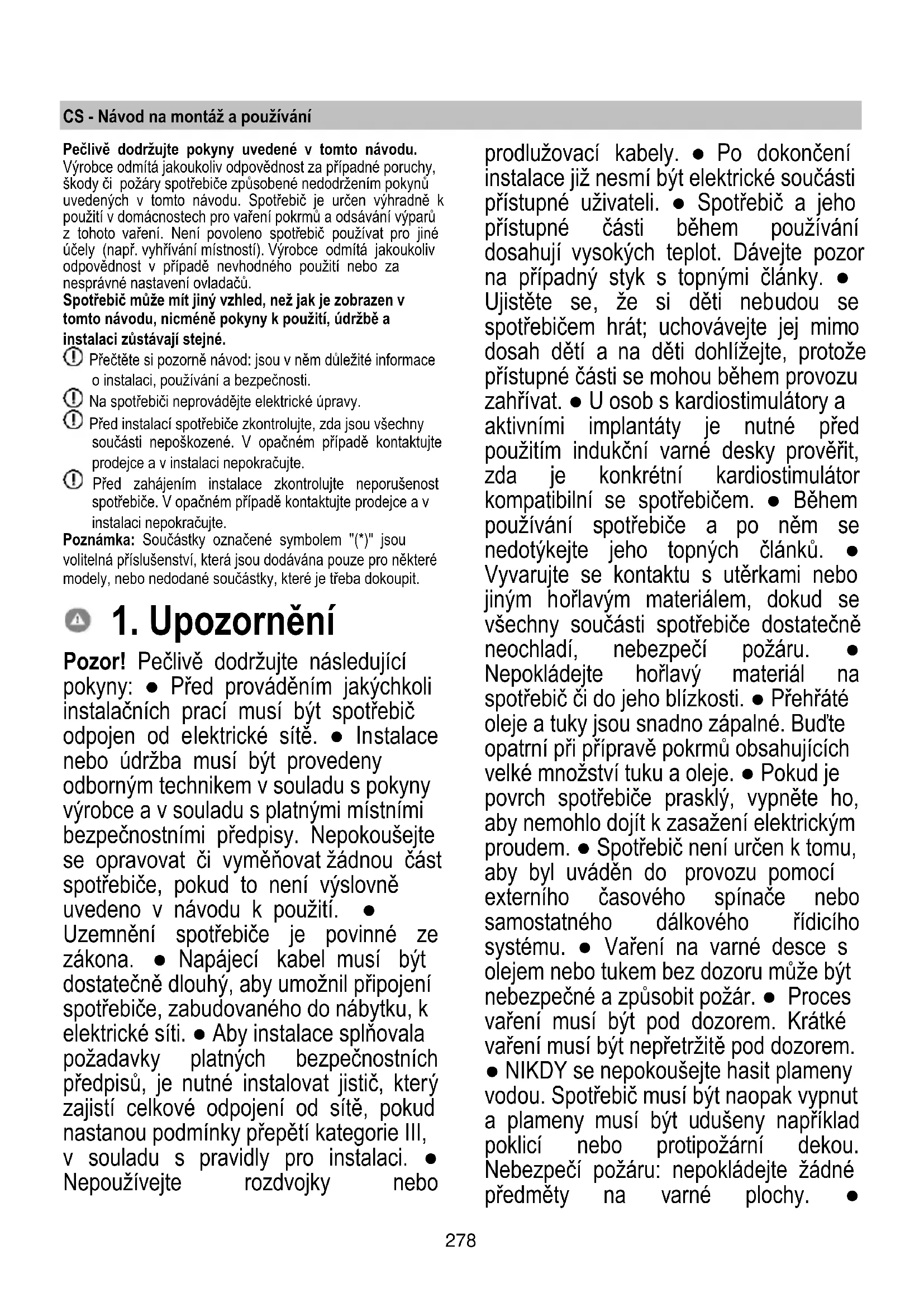 Pozor! Pečlivě dodržujte následující pokyny: ● Před prováděním jakýchkoli instalačních prací musí být spotřebič odpojen od elektrické sítě. ● Instalace nebo údržba musí být provedeny odborným technikem v souladu s pokyny výrobce a v souladu s platnými místními bezpečnostními předpisy. Nepokoušejte se opravovat či vyměňovat žádnou část spotřebiče, pokud to není výslovně uvedeno v návodu k použití. ● Uzemnění spotřebiče je povinné ze zákona. ● Napájecí kabel musí být dostatečně dlouhý, aby umožnil připojení spotřebiče, zabudovaného do nábytku, k elektrické síti. ● Aby instalace splňovala požadavky platných bezpečnostních předpisů, je nutné instalovat jistič, který zajistí celkové odpojení od sítě, pokud nastanou podmínky přepětí kategorie III, v souladu s pravidly pro instalaci. ● Nepoužívejte rozdvojky nebo prodlužovací kabely. ● Po dokončení instalace již nesmí být elektrické součásti přístupné uživateli. ● Spotřebič a jeho přístupné části během používání dosahují vysokých teplot. Dávejte pozor na případný styk s topnými články. ● Ujistěte se, že si děti nebudou se spotřebičem hrát; uchovávejte jej mimo dosah dětí a na děti dohlížejte, protože přístupné části se mohou během provozu zahřívat. ● U osob s kardiostimulátory a aktivními implantáty je nutné před použitím indukční varné desky prověřit, zda je konkrétní kardiostimulátor kompatibilní se spotřebičem. ● Během používání spotřebiče a po něm se nedotýkejte jeho topných článků. ● Vyvarujte se kontaktu s utěrkami nebo jiným hořlavým materiálem, dokud se všechny součásti spotřebiče dostatečně neochladí, nebezpečí požáru. ● Nepokládejte hořlavý materiál na spotřebič či do jeho blízkosti. ● Přehřáté oleje a tuky jsou snadno zápalné. Buďte opatrní při přípravě pokrmů obsahujících velké množství tuku a oleje. ● Pokud je povrch spotřebiče prasklý, vypněte ho, aby nemohlo dojít k zasažení elektrickým proudem. ● Spotřebič není určen k tomu, aby byl uváděn do provozu pomocí externího časového spínače nebo samostatného dálkového řídicího systému. ● Vaření na varné desce s olejem nebo tukem bez dozoru může být nebezpečné a způsobit požár. ● Proces vaření musí být pod dozorem. Krátké vaření musí být nepřetržitě pod dozorem. ● NIKDY se nepokoušejte hasit plameny vodou. Spotřebič musí být naopak vypnut a plameny musí být udušeny například poklicí nebo protipožární dekou. Nebezpečí požáru: nepokládejte žádné předměty na varné plochy. ●279 Nepoužívejte parní čističe, hrozí nebezpečí úrazu elektrickým proudem. ● Na povrch varné desky neumisťujte kovové předměty, jako jsou nože, vidličky, lžíce a víka, protože by se mohly přehřát. ● Před připojením spotřebiče k elektrické síti: zkontrolujte typový štítek (umístěný na spodní straně spotřebiče), aby se ujistili, že napětí a výkon odpovídají napětí v síti a připojovací zásuvka je vhodného typu. V případě pochyb se obraťte na kvalifikovaného elektrikáře. Důležité: ● Po použití varnou desku vypněte pomocí ovládacího zařízení a nespoléhejte se na detektor hrnců. ● Vyvarujte se přelití tekutiny, a proto při vaření nebo ohřevu tekutin snižte přívod tepla. ● Neponechávejte zapnuté topné články s prázdnými hrnci a pánvemi nebo bez nádob. ● Po dokončení vaření vypněte relativní varnou zónu. ● Nikdy k vaření nepoužívejte alobal a nikdy přímo neumísťujte výrobky zabalené v hliníkové fólii. Alobal by se mohl roztavit a došlo by k vážnému poškození vašeho spotřebiče. ● Nikdy neohřívejte ještě zavřené potravinové konzervy či plechovky: mohly by vybouchnout! Tato upozornění jsou platná i pro všechny ostatní typy varných desek. ● Použití vysokého výkonu, jako při funkci Booster, není vhodné pro ohřev určitých typů tekutin, jako například oleje na smažení. Přílišná teplota by mohla být nebezpečná. V těchto případech doporučujeme používat nižší výkon. ● Nádoby musí být umístěny přímo na varnou desku a musí být vystředěny. V žádném případě nevkládejte mezi hrnce a varnou desku jiné předměty. ● V případě vysokých teplot spotřebič automaticky snižuje úroveň výkonu varných zón. ● Před jakýmkoli čištěním nebo údržbou odpojte spotřebič od napájení odpojením zástrčky nebo odpojením hlavního vypínače obydlí. ● Při všech instalacích a údržbě používejte pracovní rukavice. ● Spotřebič mohou používat děti ve věku nejméně 8 let a osoby se sníženými fyzickými, smyslovými nebo mentálními schopnostmi nebo bez zkušeností či potřebných znalostí, za předpokladu, že jsou pod dohledem nebo poté, co obdržely pokyny týkající se bezpečného používání spotřebiče a pochopily s tím související nebezpečí. ● Děti musí být pod dozorem, aby si se spotřebičem nehrály. ● Čištění a údržbu nesmí provádět děti bez dozoru. ● Místnost musí mít dostatečné větrání, pokud je spotřebič používán současně s jinými spotřebiči na plyn nebo jiné palivo. ● Spotřebič musí být často čištěn zevnitř i zvenku (ALESPOŇ JEDNOU MĚSÍČNĚ), v každém případě dodržujte to, co je výslovně uvedeno v pokynech pro údržbu. ● Nedodržení pravidel pro čištění spotřebiče a pro výměnu a čištění filtrů představuje nebezpečí požáru. ● Vaření plamenem (flambování) je přísně zakázáno. ● Použití volných plamenů je nebezpečné pro filtry a mohlo by způsobit požár, a proto je třeba se ho v každém případě vyvarovat. ● Smažení se musí provádět pod kontrolou,