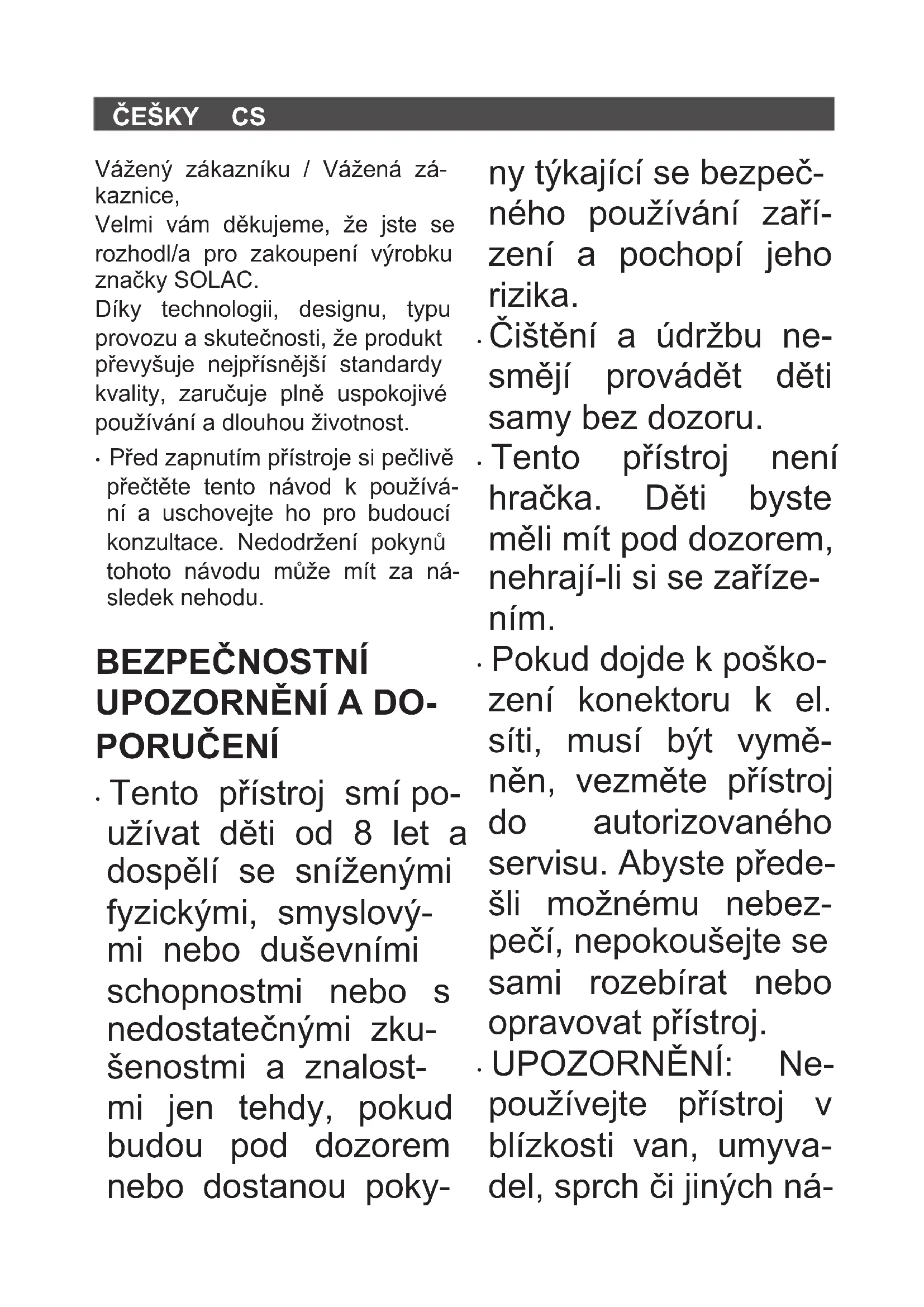 Vážený zákazníku / Vážená zá- kaznice, Velmi vám děkujeme, že jste se rozhodl/a pro zakoupení výrobku značky SOLAC. Díky technologii, designu, typu provozu a skutečnosti, že produkt převyšuje nejpřísnější standardy kvality, zaručuje plně uspokojivé používání a dlouhou životnost.