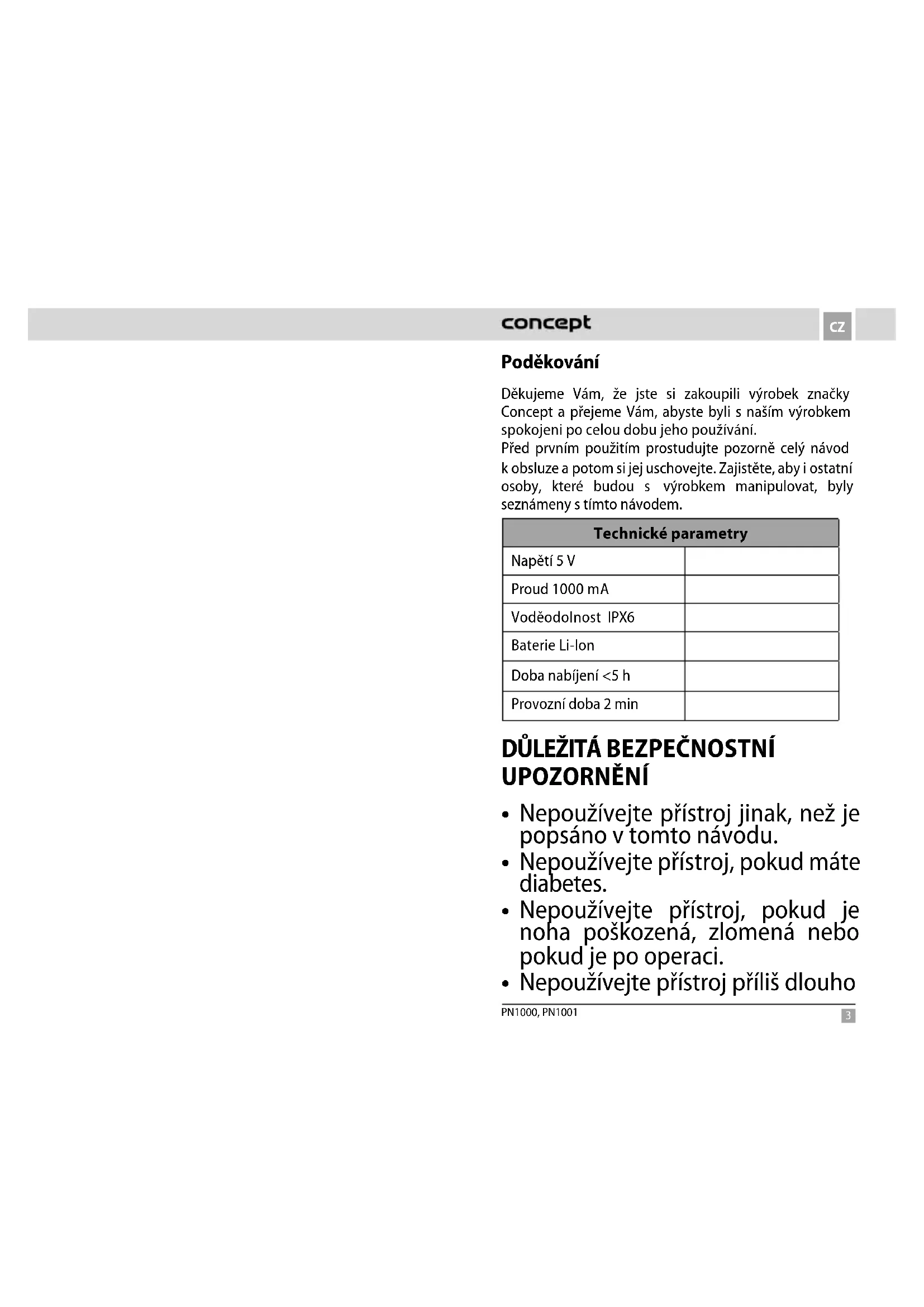 Poděkování Děkujeme Vám, že jste si zakoupili výrobek značky Concept a přejeme Vám, abyste byli s naším výrobkem spokojeni po celou dobu jeho používání. Před prvním použitím prostudujte pozorně celý návod kobsluze apotom si jej uschovejte. Zajistěte, aby iostatní osoby, které budou s výrobkem manipulovat, byly seznámeny s tímto návodem. Technické parametry Napětí 5 V Proud 1000 mA Voděodolnost IPX6 Baterie Li-Ion Doba nabíjení <5 h Provozní doba 2 min