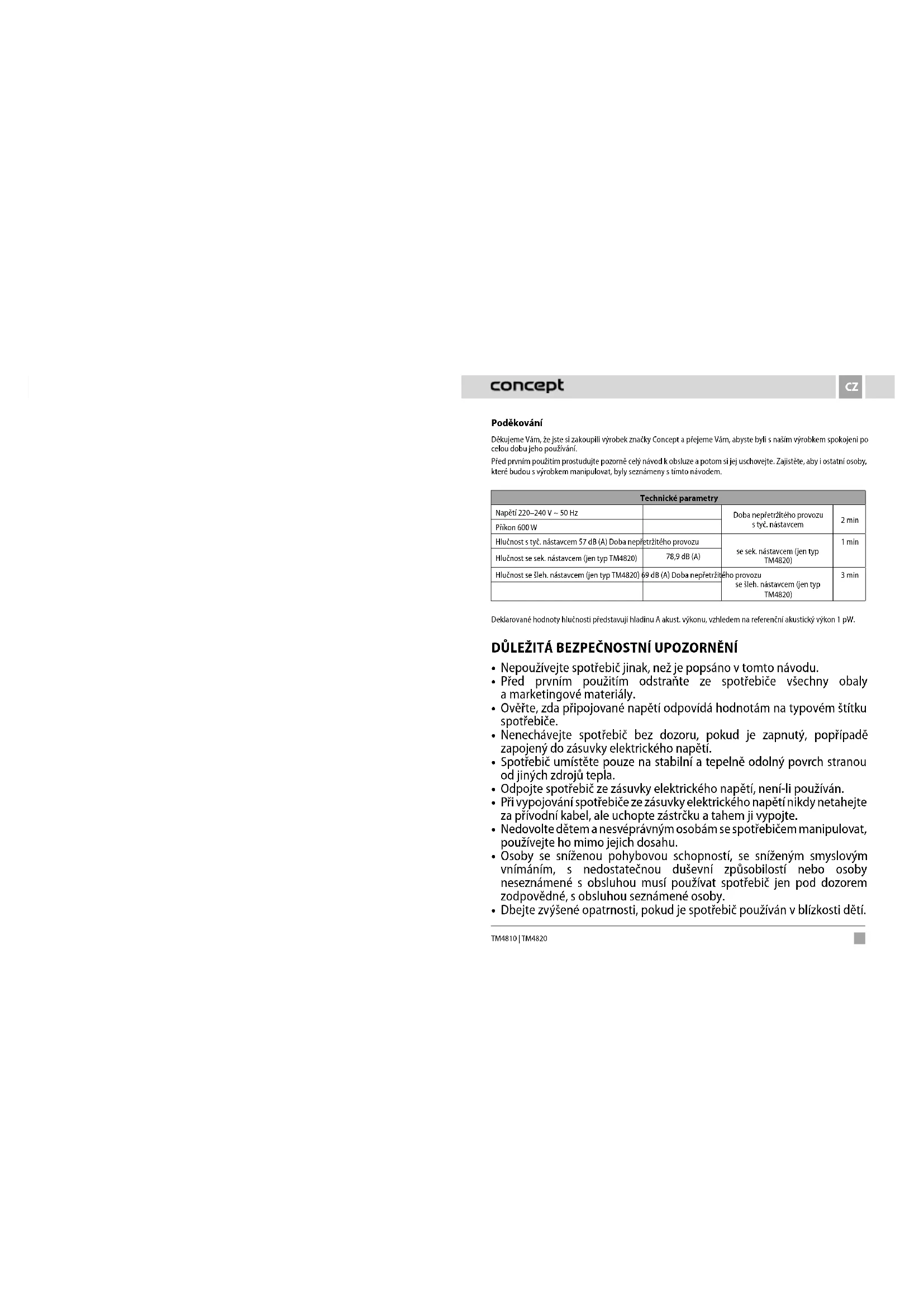 ENSK PL HU LV DE FR IT ES Stabmixer Mixeur plongeant Frullatore ad immersione Licuadora de mano Mixer vertical2 3 TM4810 | TM4820 TM4810 | TM4820 CZCZ Poděkování Děkujeme Vám, že jste si zakoupili výrobek značky Concept a přejeme Vám, abyste byli s naším výrobkem spokojeni po celou dobu jeho používání. Před prvním použitím prostudujte pozorně celý návod k obsluze a potom si jej uschovejte. Zajistěte, aby i ostatní osoby, které budou s výrobkem manipulovat, byly seznámeny s tímto návodem. Technické parametry Napětí 220–240 V ~ 50 Hz Doba nepřetržitého provozu styč. nástavcem 2 min Příkon 600 W Hlučnost s tyč. nástavcem 57 dB (A) Doba nepřetržitého provozu se sek. nástavcem (jen typ TM4820) 1 min Hlučnost se sek. nástavcem (jen typ TM4820) 78,9 dB (A) Hlučnost se šleh. nástavcem (jen typ TM4820) 69 dB (A) Doba nepřetržitého provozu se šleh. nástavcem (jen typ TM4820) 3 min Deklarované hodnoty hlučnosti představují hladinu A akust. výkonu, vzhledem na referenční akustický výkon 1 pW. DŮLEŽITÁ BEZPEČNOSTNÍ UPOZORNĚNÍ