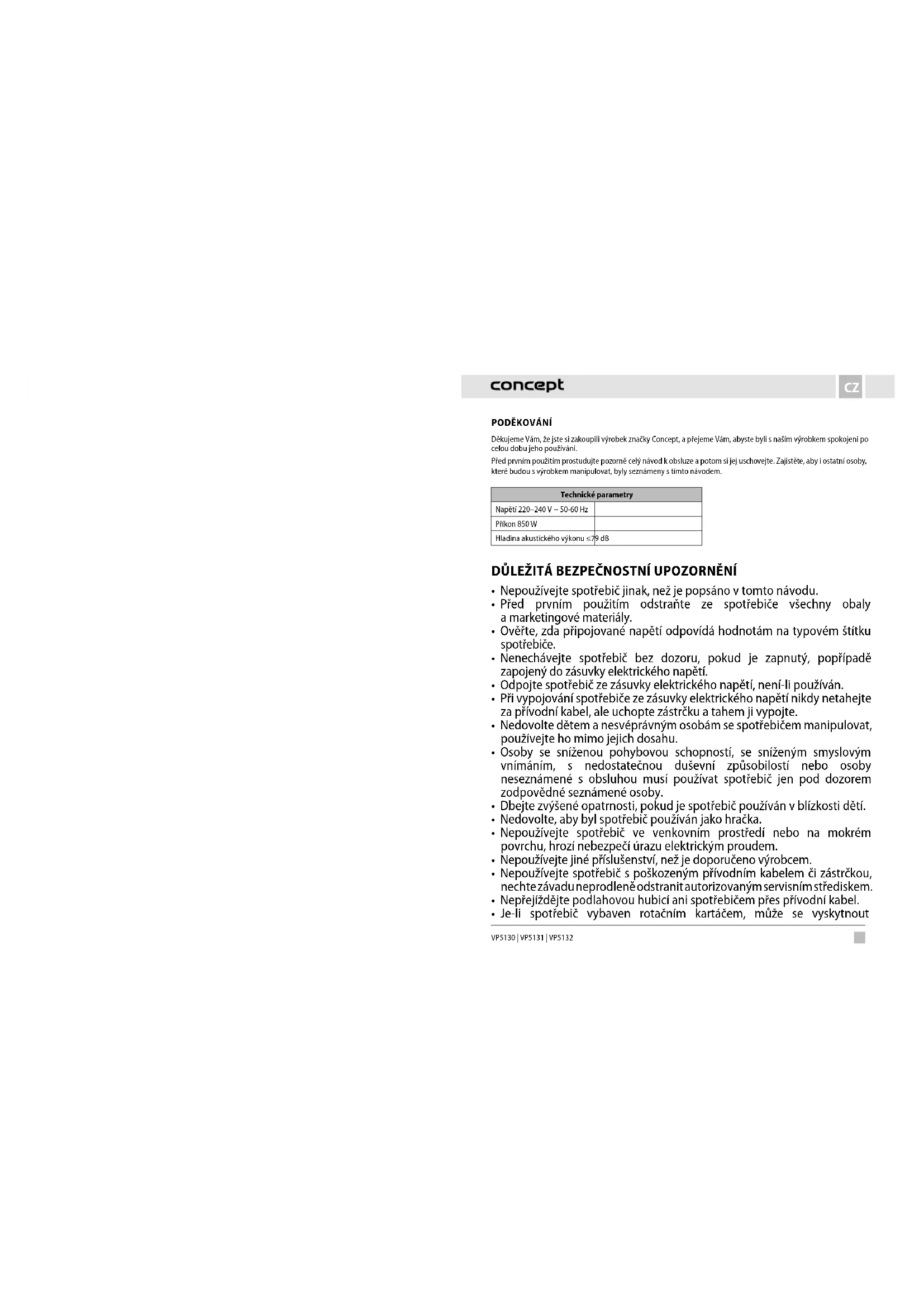 Děkujeme Vám, že jste si zakoupili výrobek značky Concept, a přejeme Vám, abyste byli s naším výrobkem spokojeni po celou dobu jeho používání. Před prvním použitím prostudujte pozorně celý návod k obsluze a potom si jej uschovejte. Zajistěte, aby i ostatní osoby, které budou s výrobkem manipulovat, byly seznámeny s tímto návodem. Technické parametry Napětí 220–240 V ~ 50-60 Hz Příkon 850 W Hladina akustického výkonu ≤79 dB DŮLEŽITÁ BEZPEČNOSTNÍ UPOZORNĚNÍ