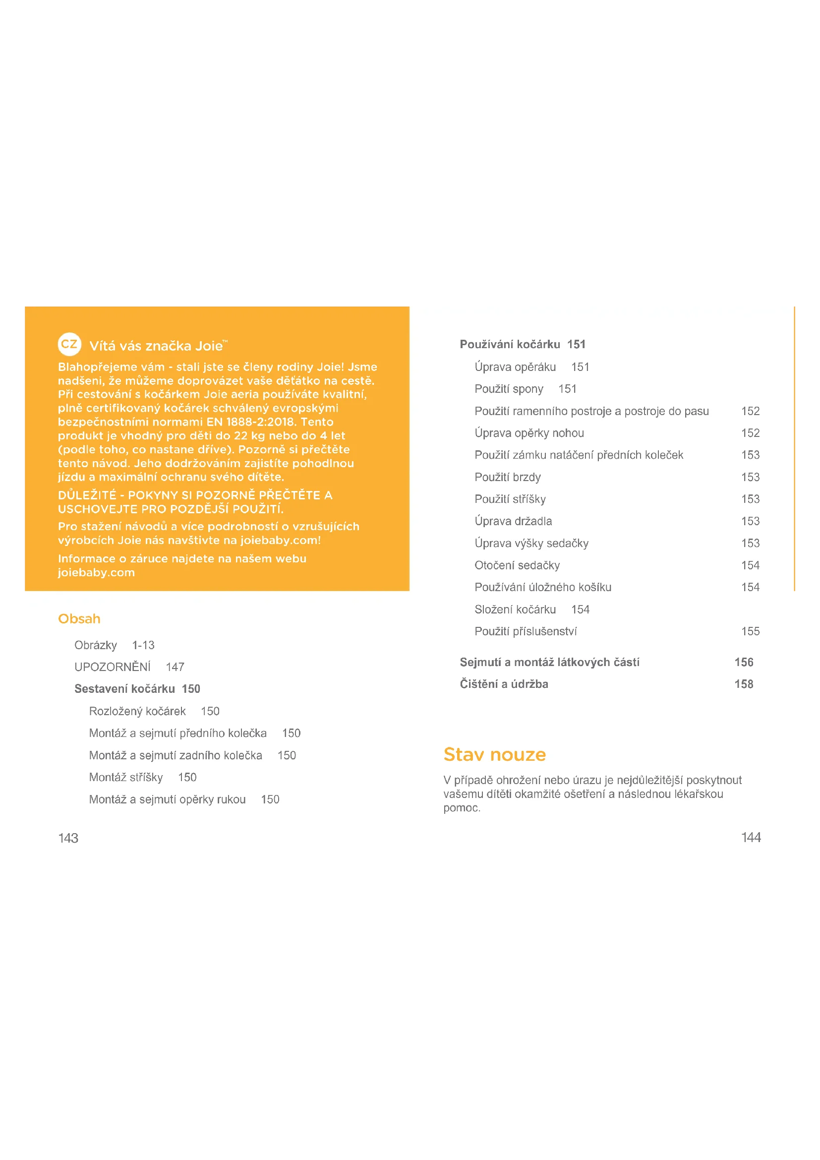 Blahopřejeme vám - stali jste se členy rodiny Joie! Jsme nadšeni, že můžeme doprovázet vaše děťátko na cestě. Při cestování s kočárkem Joie aeria používáte kvalitní, plně certifikovaný kočárek schválený evropskými bezpečnostními normami EN 1888-2:2018. Tento produkt je vhodný pro děti do 22 kg nebo do 4 let (podle toho, co nastane dříve). Pozorně si přečtěte tento návod. Jeho dodržováním zajistíte pohodlnou jízdu a maximální ochranu svého dítěte. DŮLEŽITÉ - POKYNY SI POZORNĚ PŘEČTĚTE A USCHOVEJTE PRO POZDĚJŠÍ POUŽITÍ. Pro stažení návodů a více podrobností o vzrušujících výrobcích Joie nás navštivte na joiebaby.com! Informace o záruce najdete na našem webu joiebaby.com Obsah Obrázky 1-13 UPOZORNĚNÍ 147 Sestavení kočárku 150 Rozloženýkočárek 150 Montážasejmutípředníhokolečka 150 Montážasejmutízadníhokolečka 150 Montážstříšky 150 Montážasejmutíopěrkyrukou 150 Používání kočárku 151 Úpravaopěráku 151 Použitíspony 151 Použitíramenníhopostrojeapostrojedopasu 152 Úpravaopěrkynohou 152 Použitízámkunatáčenípředníchkoleček 153 Použitíbrzdy 153 Použitístříšky 153 Úpravadržadla 153 Úpravavýškysedačky 153 Otočenísedačky 154 Používáníúložnéhokošíku 154 Složeníkočárku 154 Použitípříslušenství 155 Sejmutí a montáž látkových částí 156 Čištění a údržba 158 Stav nouze Vpřípaděohroženíneboúrazujenejdůležitějšíposkytnout vašemudítětiokamžitéošetřeníanáslednoulékařskou pomoc.145