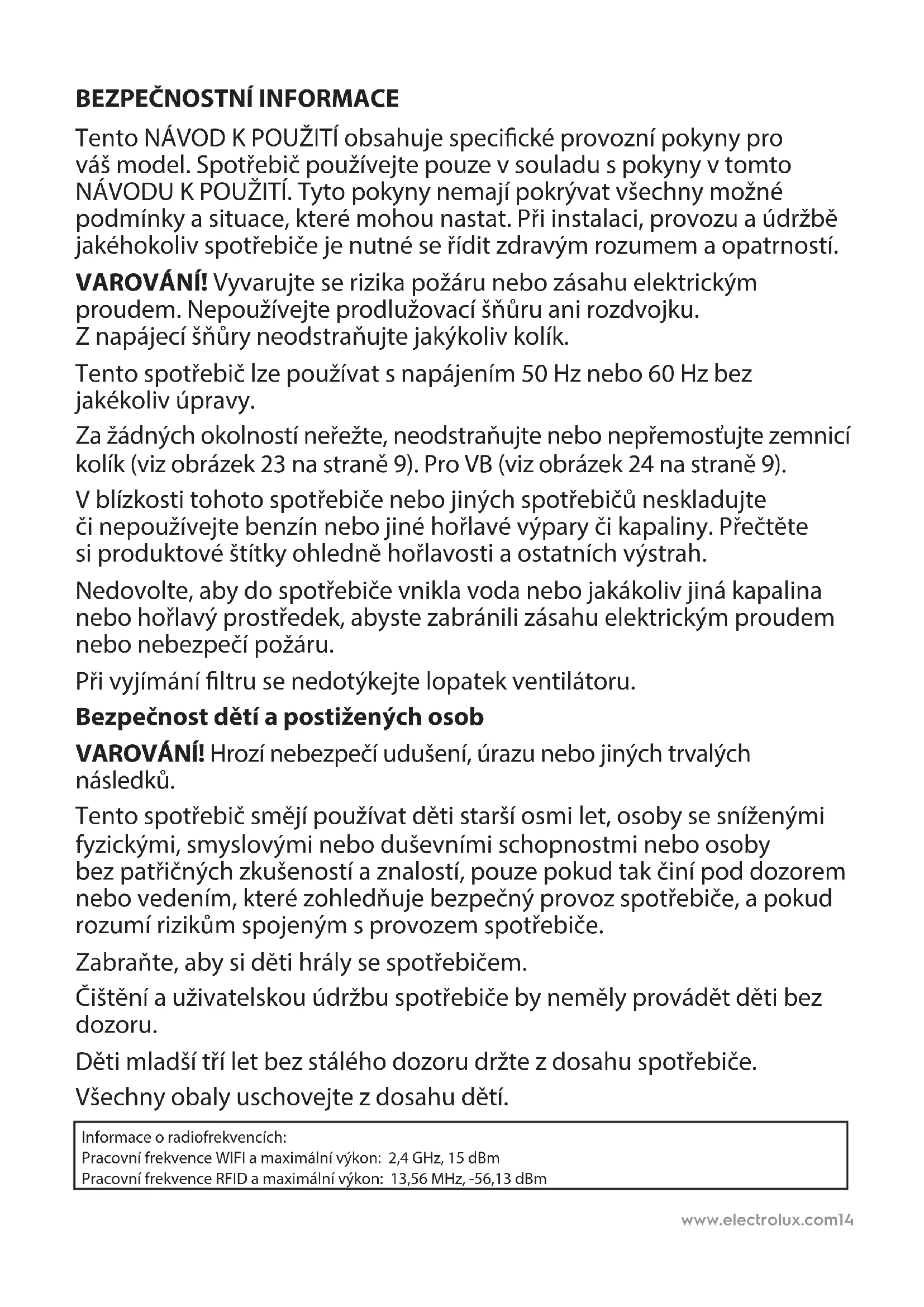 Tento NÁVOD K POUŽITÍ obsahuje specické provozní pokyny pro váš model. Spotřebič používejte pouze v souladu s pokyny v tomto NÁVODU K POUŽITÍ. Tyto pokyny nemají pokrývat všechny možné podmínky a situace, které mohou nastat. Při instalaci, provozu a údržbě jakéhokoliv spotřebiče je nutné se řídit zdravým rozumem a opatrností. VAROVÁNÍ! Vyvarujte se rizika požáru nebo zásahu elektrickým proudem. Nepoužívejte prodlužovací šňůru ani rozdvojku. Z napájecí šňůry neodstraňujte jakýkoliv kolík. Tento spotřebič lze používat s napájením 50 Hz nebo 60 Hz bez jakékoliv úpravy. Za žádných okolností neřežte, neodstraňujte nebo nepřemosťujte zemnicí kolík (viz obrázek 23 na straně 9). Pro VB (viz obrázek 24 na straně 9). V blízkosti tohoto spotřebiče nebo jiných spotřebičů neskladujte či nepoužívejte benzín nebo jiné hořlavé výpary či kapaliny. Přečtěte si produktové štítky ohledně hořlavosti a ostatních výstrah. Nedovolte, aby do spotřebiče vnikla voda nebo jakákoliv jiná kapalina nebo hořlavý prostředek, abyste zabránili zásahu elektrickým proudem nebo nebezpečí požáru. Při vyjímání ltru se nedotýkejte lopatek ventilátoru. Bezpečnost dětí a postižených osob VAROVÁNÍ! Hrozí nebezpečí udušení, úrazu nebo jiných trvalých následků. Tento spotřebič smějí používat děti starší osmi let, osoby se sníženými fyzickými, smyslovými nebo duševními schopnostmi nebo osoby bez patřičných zkušeností a znalostí, pouze pokud tak činí pod dozorem nebo vedením, které zohledňuje bezpečný provoz spotřebiče, a pokud rozumí rizikům spojeným s provozem spotřebiče. Zabraňte, aby si děti hrály se spotřebičem. Čištění a uživatelskou údržbu spotřebiče by neměly provádět děti bez dozoru. Děti mladší tří let bez stálého dozoru držte z dosahu spotřebiče. Všechny obaly uschovejte z dosahu dětí. Informace o radiofrekvencích: Pracovní frekvence WIFI a maximální výkon: 2,4 GHz, 15 dBm Pracovní frekvence RFID a maximální výkon: 13,56 MHz, -56,13 dBmwww.electrolux.com 15 Elektrické informace VAROVÁNÍ! Vyvarujte se rizika požáru nebo zásahu elektrickým proudem. Pokud si nejste jistí, zda je zásuvka řádně uzemněna nebo chráněna pojistkou nebo jističem, obraťte se na kvalikovaného elektrikáře a požádejte ho o instalování zásuvky v souladu s národní elektrickou normou amístními elektrickými předpisy a nařízeními. Nepoužívejte prodlužovací šňůru ani rozdvojku. Nikdy neodpojujte zástrčku spotřebiče od sítě zatažením za napájecí kabel. Vždy pevně uchopte zástrčku avytáhněte ji přímo ze zásuvky. Napájecí kabel nesmí být skřípnutý, ohnutý nebo zauzlený. Neřežte nebo nepoškozujte napájecí kabel. Pokud je napájecí kabel poškozený, měl by jej vyměnit pouze autorizovaný servis společnosti Electrolux. Tento spotřebič neobsahuje žádné součásti, které by mohl opravit uživatel. Kvůli opravám vždy zavolejte autorizovaný servis společnosti Electrolux. Jestliže je poškozený přívodní kabel, smí ho vyměnit pouze výrobce, servisní technik nebo osoba s podobnou příslušnou kvalikací, jinak by mohlo dojít k úrazu. Ujistěte se, že před čištěním zařízení odpojíte od napájení, abyste zabránili úrazu elektrickým proudem nebo riziku požáru. ČEŠTINA Děkujeme vám, že jste zvolili čističku vzduchu Electrolux PURE A9-40/PURE A9-60. Vždy používejte originální příslušenství a náhradní díly pro zajištění nejlepších výsledků. Tento spotřebič je navržen s ohledem na životní prostředí. Všechny plastové součásti jsou označeny pro účely recyklace.