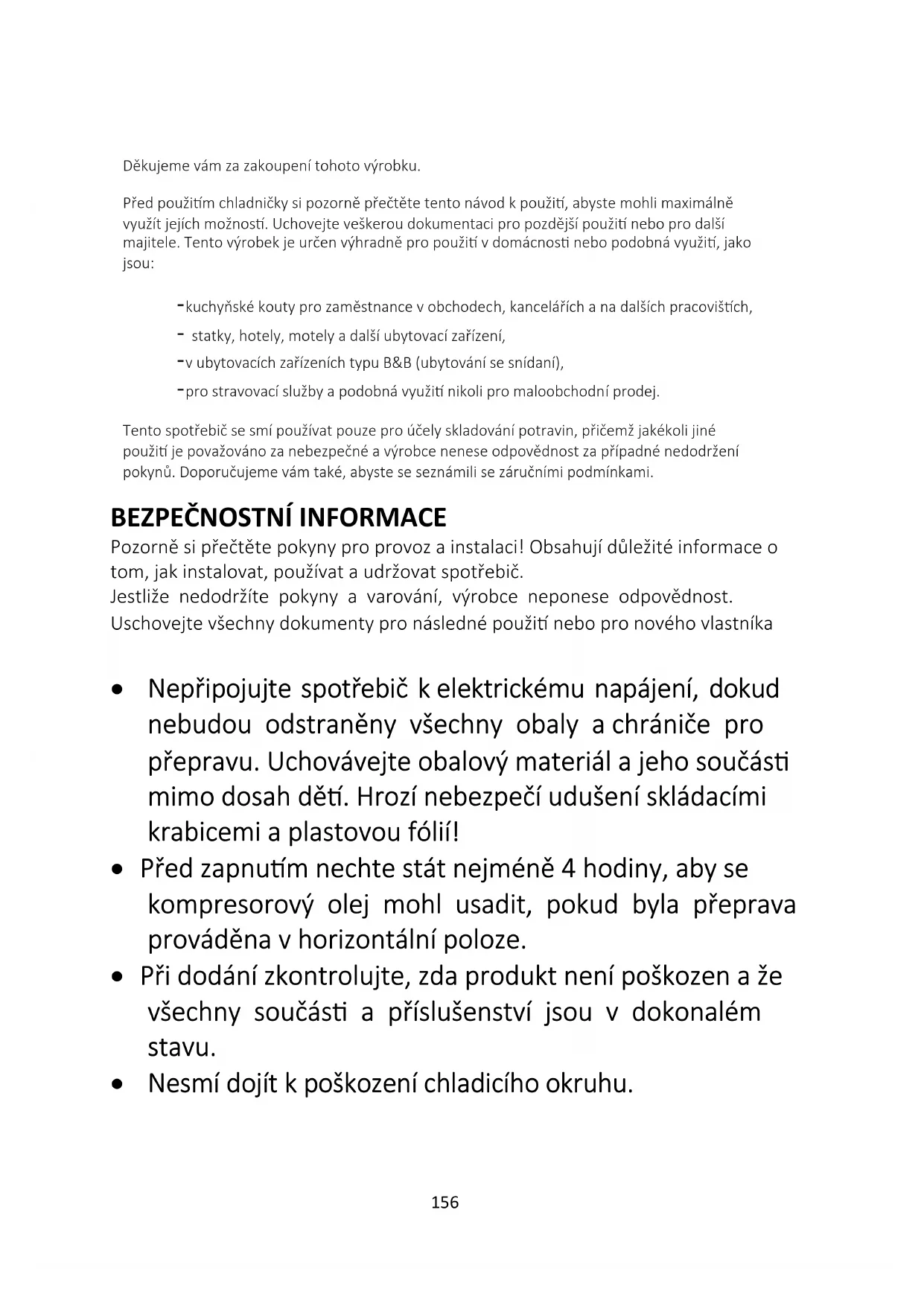 Pozorně si přečtěte pokyny pro provoz a instalaci! Obsahují důležité informace o tom, jak instalovat, používat a udržovat spotřebič. Jestliže nedodržíte pokyny a varování, výrobce neponese odpovědnost. Uschovejte všechny dokumenty pro následné použití nebo pro nového vlastníka Nepřipojujte spotřebič k elektrickému napájení, dokud nebudou odstraněny všechny obaly a chrániče pro přepravu. Uchovávejte obalový materiál a jeho součásti mimo dosah dětí. Hrozí nebezpečí udušení skládacími krabicemi a plastovou fólií! Před zapnutím nechte stát nejméně 4 hodiny, aby se kompresorový olej mohl usadit, pokud byla přeprava prováděna v horizontální poloze. Při dodání zkontrolujte, zda produkt není poškozen a že všechny součásti a příslušenství jsou v dokonalém stavu. Nesmí dojít k poškození chladicího okruhu.157 Větrací otvory ve skříni spotřebiče nebo ve vestavné konstrukci musí zůstat volné. Nikdy nepoužívejte vodu k mytí polohy kompresoru, po očištění jej důkladně otřete suchým hadříkem, abyste zabránili korozi. Se spotřebičem vždy manipulujte alespoň ve dvou osobách, protože je těžký Nainstalujte spotřebič na místo odpovídající jeho velikost a používání a vyrovnejte ho Ujistěte se, že parametry elektrického napájení se shodují s údaji na typovém štítku. V opačném případě kontaktujte elektrikáře Spotřebič pracuje s napájením 220–240 VAC/50 Hz. Nenormální kolísání napětí může způsobit, že spotřebič se nespustí, nebo se poškodí regulátor teploty či kompresor, případně se může za chodu ozývat neobvyklý hluk. V takovém případě by se měl nainstalovat automatický regulátor Pouze pro Spojené království: Napájecí kabel spotřebiče je vybaven trojpólovou zástrčkou (s uzemněním), která se zapojuje do standardní trojpólové zásuvky (s uzemněním). Nikdy neodřezávejte ani nedemontujte třetí kolík (uzemnění). Zástrčka by měla být přístupná po instalaci spotřebiče Dbejte na to, aby během přepravy a po přepravě/přemisťování spotřebiče nebyl síťový kabel zachycen pod spotřebičem, aby nedošlo k přeseknutí158 nebo poškození síťového kabelu. Pokud je napájecí kabel poškozen, musí být vyměněn výrobcem, jeho servisním technikem nebo podobně kvalifikovanou osobou, aby se zabránilo nebezpečí. Neumisťujte spotřebič ve vlhkém, mastném nebo prašném prostředí, ani jej nevystavujte přímému slunečnímu záření a působení vody. Neumisťujte spotřebič do blízkosti topných těles nebo hořlavých materiálů. PRO spotřebiče s mrazákem: pokud dojde k výpadku napájení, neotevírejte víko. Jestliže trvá výpadek méně hodin, než je uvedeno na typovém štítku (Doba vzrůstu teploty), nemělo by to ovlivnit zmrazené potraviny. Jestliže trvá výpadek déle, je nutné potraviny zkontrolovat a okamžitě zkonzumovat, nebo uvařit a potom opět zmrazit Pokud zjistíte, že víko spotřebiče se ihned po zavření obtížně otvírá, nemějte obavy. Je to způsobeno rozdílem tlaku, který se vyrovná a za několik minut budete moci víko normálně otevřít Ve spotřebiči neskladujte léky, bakterie ani chemické látky. Tento spotřebič je určen k použití v domácnosti, nedoporučuje se v něm skladovat materiály, které vyžadují přesně stanovené teploty Netahejte silou za přívodní kabel ani jej neskládejte a nedotýkejte se zástrčky mokrýma rukama.159 Ve spotřebiči neskladujte látky obsahující hořlavý hnací plyn (např. aerosolové nádoby) nebo výbušné látky. Hrozí nebezpečí výbuchu! Nepokládejte na horní stranu chladničky nestabilní předměty (těžké předměty, nádoby naplněné vodou), aby se předešlo zranění způsobenému pádem nebo elektrickým proudem v důsledku styku s vodou Nepoužívejte elektrické spotřebiče uvnitř úložných oddílů pro potraviny ve spotřebiči, pokud nejsou tyto typy přímo doporučeny výrobcem. Nedotýkejte se vnitřních chladicích prvků, zejména mokrýma rukama, aby nedošlo k prasknutí nebo zranění. Nebezpečí hrozí dětem, osobám s omezenými fyzickými, smyslovými nebo duševními schopnostmi, stejně jako osobám s nedostatečnými znalostmi o bezpečném používání spotřebiče. Zkontrolujte, zda děti a ohrožené osoby chápou nebezpečí. Osoba zodpovědná za bezpečnost musí dohlížet na děti a ohrožené osoby používající spotřebič, nebo je musí poučit. Spotřebič mohou používat pouze děti starší osmi let" Děti si se spotřebičem nesmějí hrát. Děti ve věku od 3 do 8 let mohou do tohoto spotřebiče vkládat a vyjímat z něj věci. PRO spotřebiče s mrazákem: neukládejte do mrazáku tekutiny v láhvích nebo plechovkách (zejména nápoje160 sycené oxidem uhličitým). Láhve a plechovky mohou prasknout! PRO spotřebiče s mrazákem: nikdy nevkládejte do úst zmrazené potraviny přímo z mrazáku. Hrozí nebezpečí vzniku omrzlin! Chraňte plastové součásti a těsnění dveří před olejem a tukem. Jinak by se na plastových součástech a těsnění dveří mohly vytvořit póry Před provedením jakéhokoli úkonu odpojte napájecí kabel ze zásuvky. Nepoužívejte mechanické nástroje nebo jiné prostředky k urychlení procesu odmrazování, pokud nejsou doporučeny výrobcem. K odstranění námrazy nepoužívejte špičaté nebo ostré předměty, jako jsou nože nebo vidličky. K odmrazování nikdy nepoužívejte vysoušeče vlasů, elektrické ohřívače nebo jiné podobné elektrické spotřebiče. Doporučuje se udržovat zástrčku v čistotě, neboť nadměrný nános prachu na zástrčce může být příčinou požáru. Nepokoušejte se opravovat, rozebírat nebo upravovat spotřebič vlastními silami. Je-li nutná oprava, vždy se obraťte na náš zákaznický servis. Během čištění