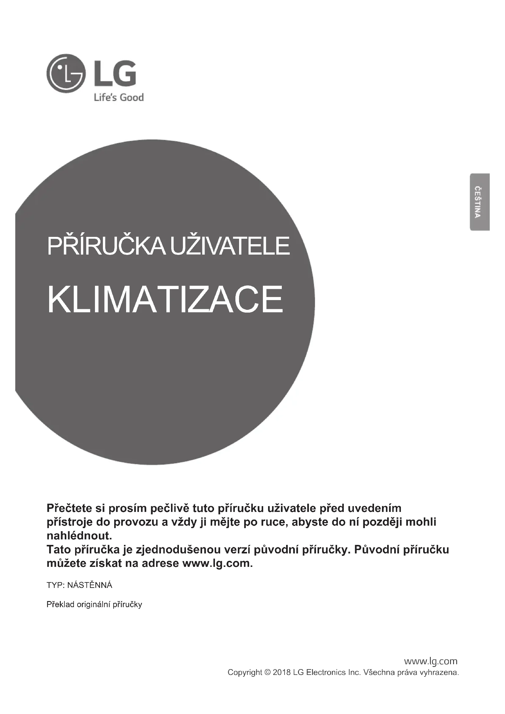 - * gumbi mogu biti drugačiji prema vrsti modela.PŘÍRUČKA UŽIVATELE KLIMATIZACE Přečtete si prosím pečlivě tuto příručku uživatele před uvedením přístroje do provozu a vždy ji mějte po ruce, abyste do ní později mohli nahlédnout. Tato příručka je zjednodušenou verzí původní příručky. Původní příručku můžete získat na adrese www.lg.com.