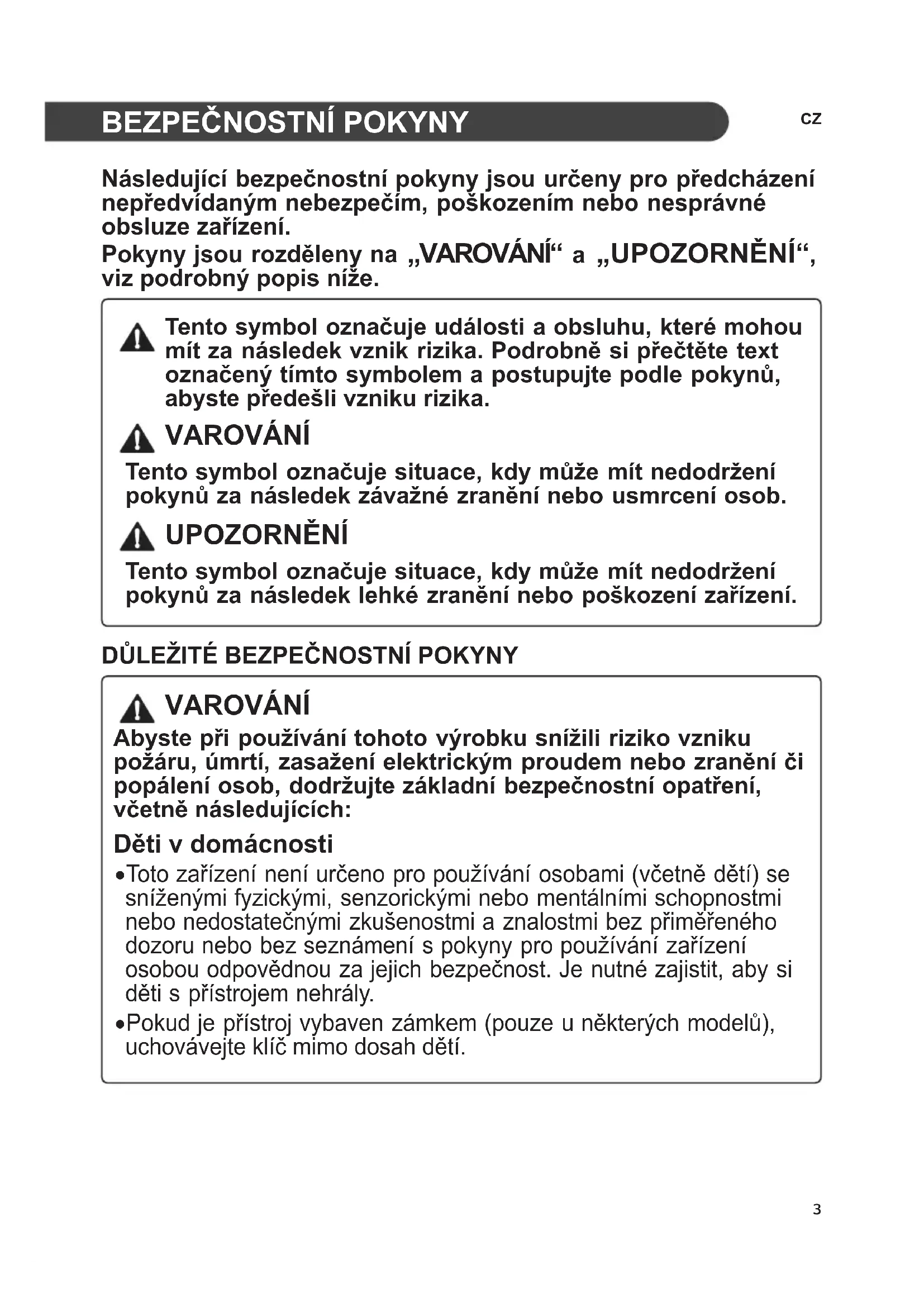 VAROVÁNÍ Abyste při používání tohoto výrobku snížili riziko vzniku požáru, úmrtí, zasažení elektrickým proudem nebo zranění či popálení osob, dodržujte základní bezpečnostní opatření, včetně následujících: Děti v domácnosti