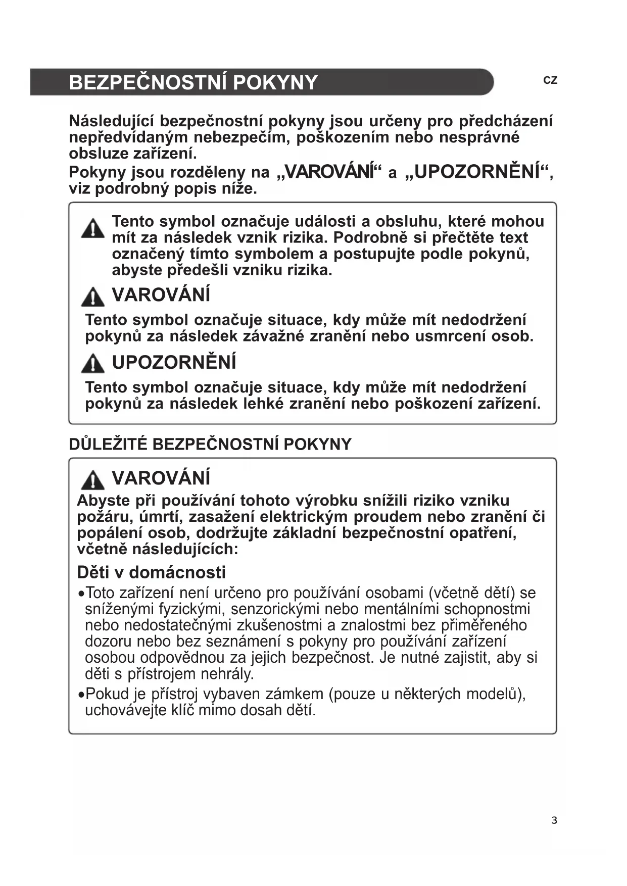 VAROVÁNÍ Abyste při používání tohoto výrobku snížili riziko vzniku požáru, úmrtí, zasažení elektrickým proudem nebo zranění či popálení osob, dodržujte základní bezpečnostní opatření, včetně následujících: Děti v domácnosti