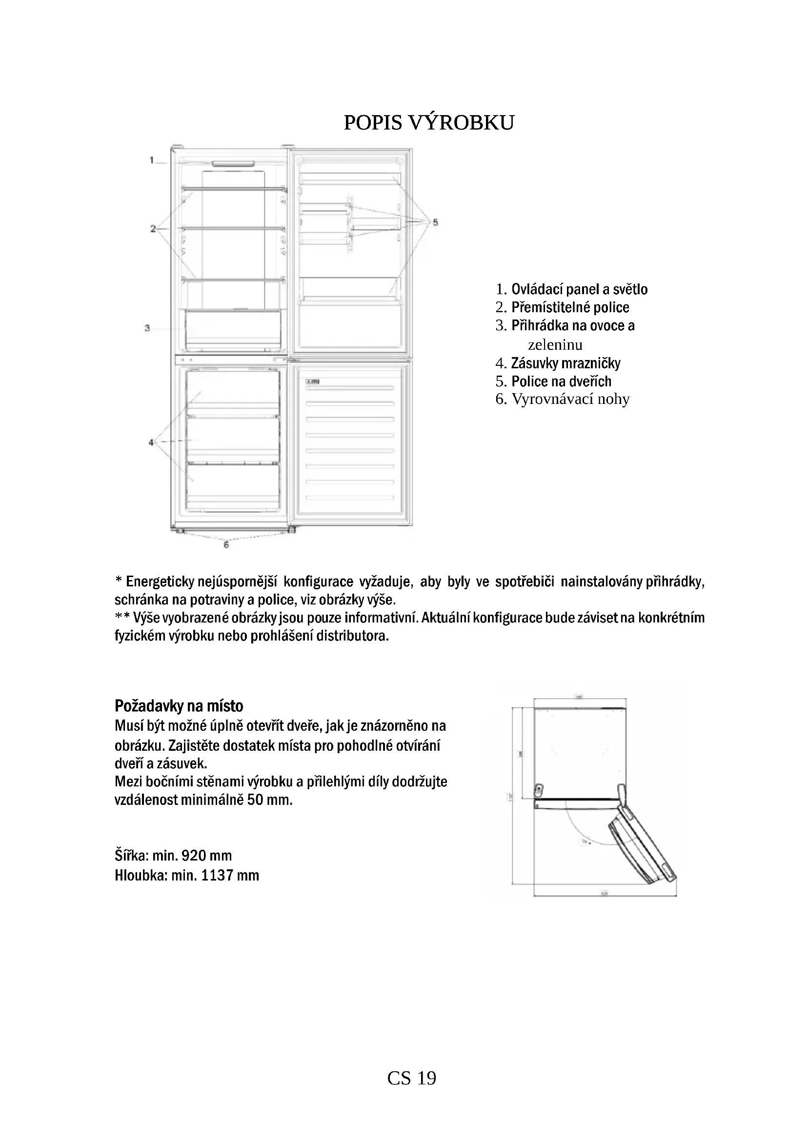 - Energeticky nejúspornější konfigurace vyžaduje, aby byly ve spotřebiči nainstalovány přihrádky, schránka na potraviny a police, viz obrázky výše. ** Výše vyobrazené obrázky jsou pouze informativní. Aktuální konfigurace bude záviset na konkrétním fyzickém výrobku nebo prohlášení distributora. Požadavky na místo Musí být možné úplně otevřít dveře, jak je znázorněno na obrázku. Zajistěte dostatek místa pro pohodlné otvírání dveří a zásuvek. Mezi bočními stěnami výrobku a přilehlými díly dodržujte vzdálenost minimálně 50 mm. Šířka: min. 920 mm Hloubka: min. 1137 mmCS 20