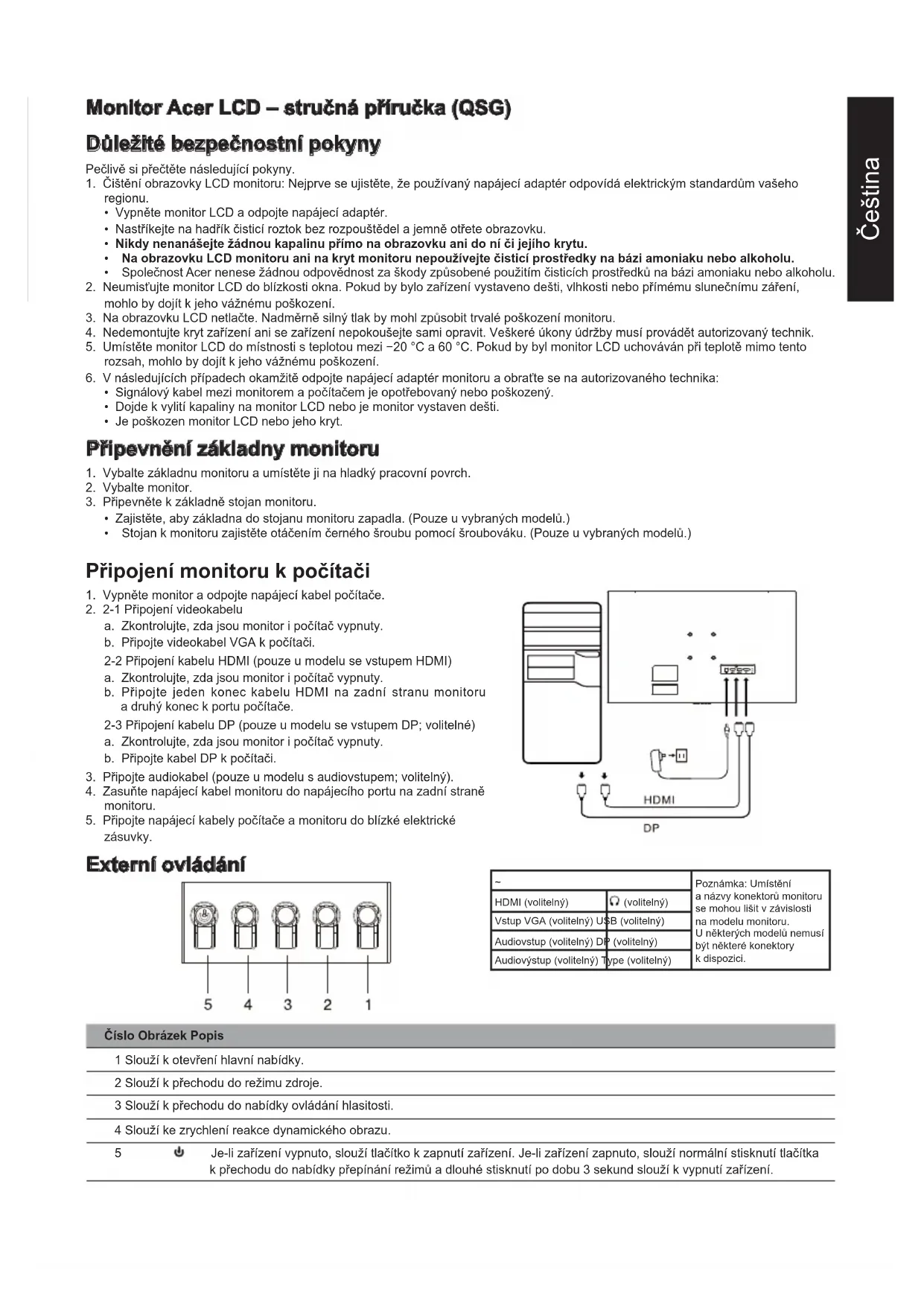 - 年間エネルギー消費量は、4 時間/日 x 365 日/年の標準消費電力に基づき算出しています。Čeština Monitor Acer LCD – stručná příručka (QSG) Důležité bezpečnostní pokyny Pečlivě si přečtěte následující pokyny. 1. Čištění obrazovky LCD monitoru: Nejprve se ujistěte, že používaný napájecí adaptér odpovídá elektrickým standardům vašeho regionu.