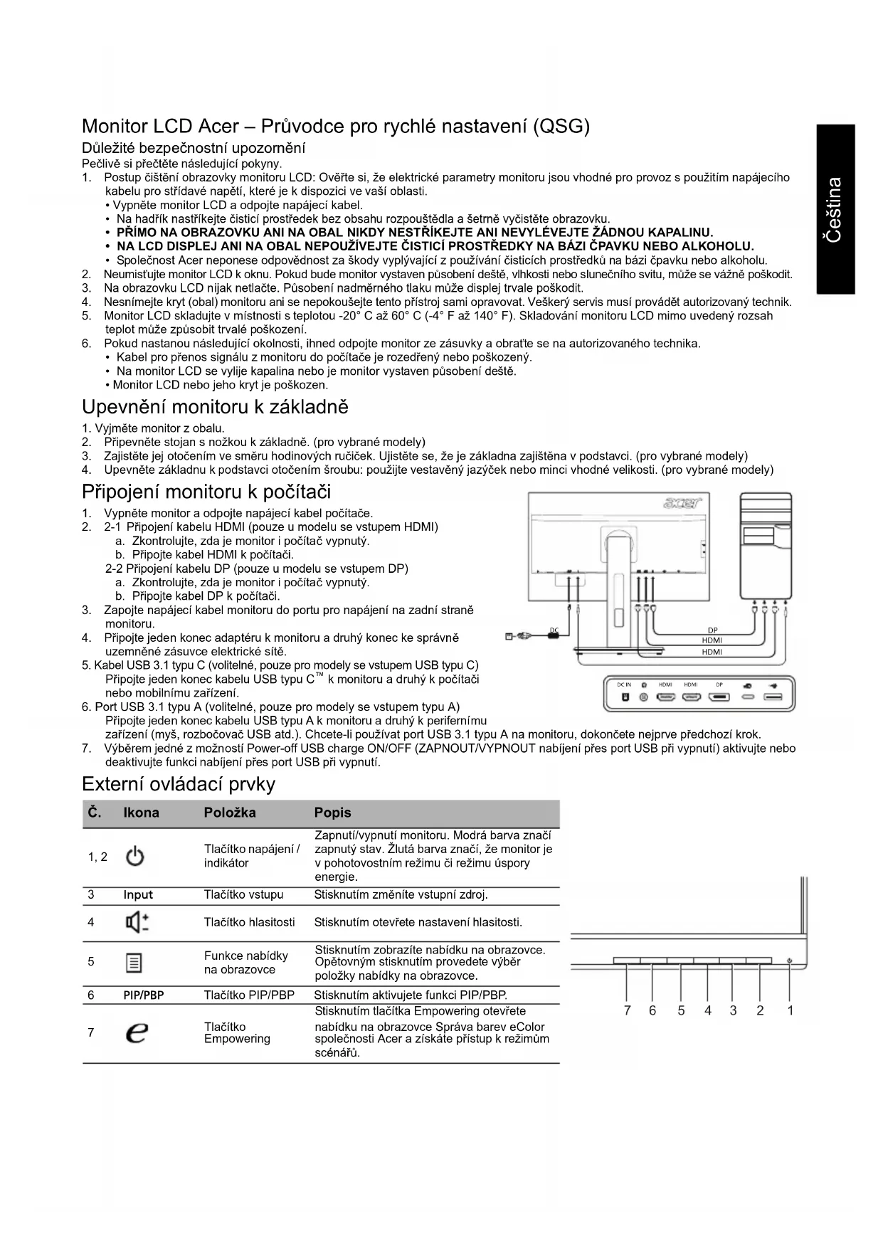 DC IN 1234567Čeština Předpisy a bezpečnostní upozornění Upozornění FCC (Federálního výboru pro telekomunikace) Toto zařízení bylo testováno a splňuje limity pro třídu B digitálních zařízení, podle oddílu 15 Pravidel FCC. Tyto limity zabezpečují odpovídající ochranu proti škodlivému rušení při instalaci v domácnosti. Toto zařízení generuje, používá a může vyzařovat vysokofrekvenční energii, a pokud není instalováno a používáno v souladu s instrukcemi, může způsobit škodlivé rušení rádiové komunikace. Nelze však zaručit, že se rušení v určité instalaci neobjeví. Jestliže toto zařízení způsobí škodlivé rušení rádiového nebo televizního příjmu, které lze zjistit vypnutím nebo zapnutím zařízení, je uživateli doporučeno pokusit se rušení potlačit jedním z následujících opatření: Přesměrujte nebo přemístěte přijímací anténu. Zvětšete odstup mezi zařízením a přijímačem. Připojte zařízení k jinému výstupu okruhu, než ke kterému je nyní připojen. Poraďte se s distributorem nebo zkušeným technikem specializovaným na obor rádio a televizory. Prohlášení o shodě CE Společnost Acer Inc. tímto prohlašuje, že tento monitor LCD je v souladu se základními požadavky a dalšími platnými ustanoveními směrnice EMC 2014/30/EU, 2014/35/EU (směrnice týkající se nízkého napětí), směrnice RoHS 2011/65/EU a směrnice 2009/125/EC, týkající se rámců pro stanovení požadavků na ekologickou konstrukci pro produkty využívající energii. Upozornění: Nezvedejte monitor za základnu, aby nedošlo k poškození monitoru. Upozornění: Stíněné kabely Veškerá připojení k jiným zařízením výpočetní techniky je nutno provádět s využitím stíněných kabelů, aby byla zajištěna shoda s předpisy pro elektromagnetickou kompatibilitu (EMC). Upozornění: Periferní zařízení K tomuto zařízení smějí být připojena pouze periferní zařízení (zařízení pro vstup a výstup signálu, terminály, tiskárny apod.) certifikovaná ohledně shody s limity pro třídu B. Provoz necertifikovaných periferních zařízení pravděpodobně způsobí rušení příjmu rádia a televize. Varování Změny nebo úpravy, které nejsou výslovně schváleny výrobcem, by mohly anulovat oprávnění uživatele používat tento produkt (oprávnění garantuje Federální výbor pro telekomunikace). Provozní podmínky Toto zařízení vyhovuje požadavkům FCC, oddíl 15. Provoz podléhá těmto dvěma podmínkám: (1) toto zařízení nesmí být zdrojem škodlivého rušení a (2) toto zařízení musí akceptovat jakékoli přijímané rušení, včetně rušení, které může být příčinou nežádoucího provozu. Upozornění: Uživatelé v Kanadě Tento digitální přístroj třídy B vyhovuje kanadskému standardu ICES-003. Remarque à l'intention des utilisateurs canadiens Cet appareil numérique de la classe B est conforme à la norme NMB-003 du Canada. Likvidace zařízení vyřazených uživateli v soukromých domácnostech v Evropské unii Tento symbol na produktu nebo jeho obalu znamená, že produkt nesmí být likvidován s běžným domácím odpadem. Namísto toho přejímáte odpovědnost za likvidaci zařízení tak, že je odevzdáte na určeném sběrném místě pro recyklaci vyřazených elektrických a elektronických zařízení. Třídění a recyklace vyřazených zařízení přispívá k ochraně přírodních zdrojů a zajistí recyklaci zařízení způsobem, jenž ochrání zdraví osob i životního prostředí. Další informace o tom, kde můžete své vyřazené zařízení předat k recyklaci, vám poskytne místní obecní úřad, komunální služby nebo obchod, kde jste produkt zakoupili. Vyrovná zpráva týkajíc se magnetu Některá elektronická zařízení, například pevné disky, zařízení USB, tablety, notebooky, mobilní telefony, hodinky, sluchátka do uší, reproduktory, kreditní karty, magnetické identifikační karty a podobně jsou citlivá na magnetická pole a mohou se trvale nebo dočasně poškodit, pokud jsou vystavena působení příliš silného magnetického pole. Elektronická zařízení se nesmí pokládat přímo na nebo blízko magnetické oblasti základny monitoru. MagnetČeština TECHNICKÉ ÚDAJE Návody a další dokumenty pro svůj produkt Acer naleznete na oficiálních webových stránkách podpory společnosti Acer. *Roční spotřeba energie se počítá s využitím typické spotřeby energie 4 hodiny denně, 365 dní v roce. Panel LCD Provozní systém Barevný LCD TFT Velikost 27”W (69 cm) Rozteč pixelů 0,233 mm (horizontálně) × 0,233 mm (vertikálně) Jas 350 cd/m