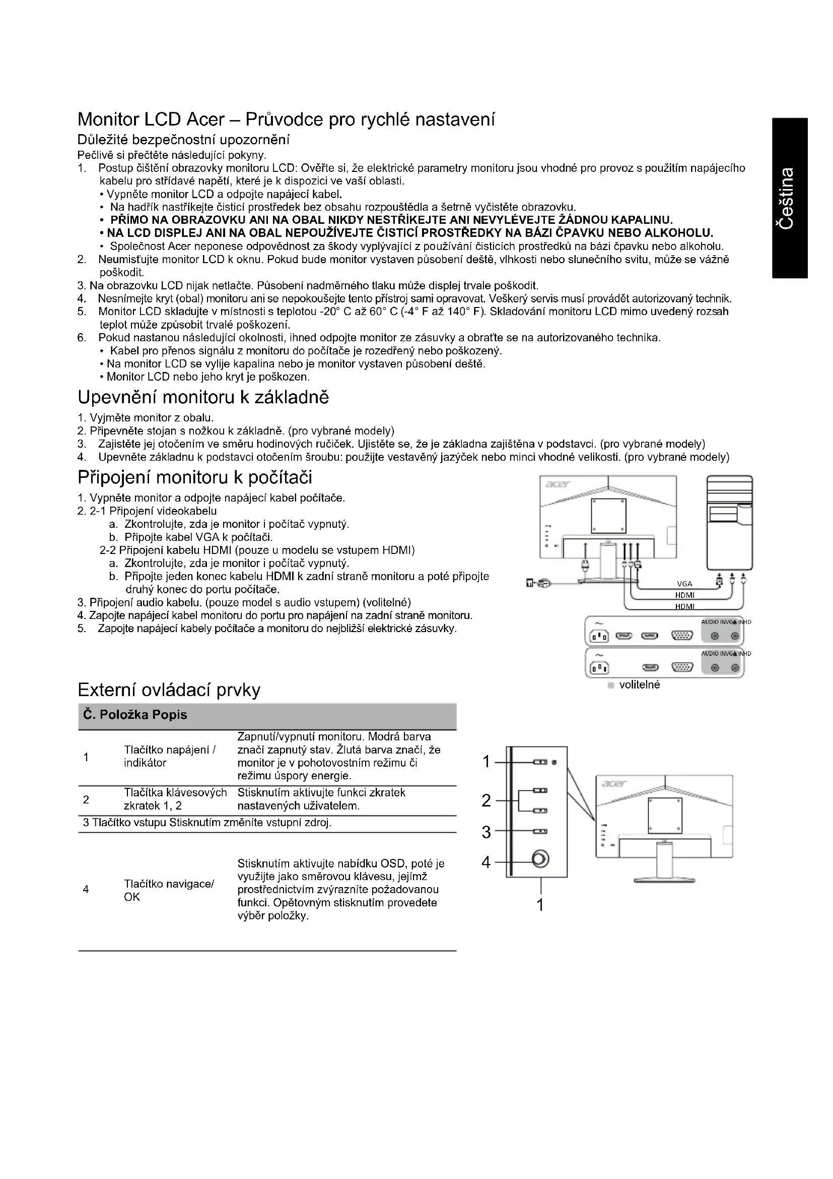 仕様は モ デルや地域に よ り 異な り ま す。Čeština Monitor LCD Acer – Průvodce pro rychlé nastavení Důležité bezpečnostní upozornění Pečlivě si přečtěte následující pokyny. 1. Postup čištění obrazovky monitoru LCD: Ověřte si, že elektrické parametry monitoru jsou vhodné pro provoz s použitím napájecího kabelu pro střídavé napětí, které je k dispozici ve vaší oblasti.• Vypněte monitor LCD a odpojte napájecí kabel.