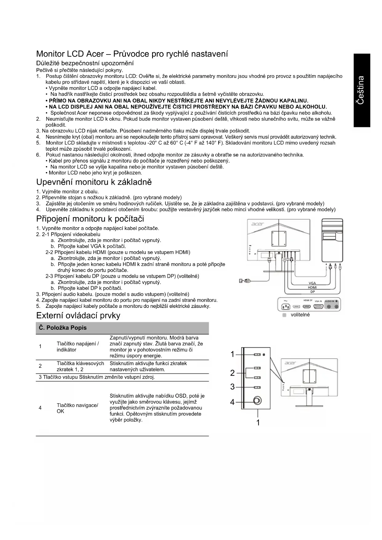 仕様は モ デ ルや地域に よ り 異な り ま す。Čeština Monitor LCD Acer – Průvodce pro rychlé nastavení Důležité bezpečnostní upozornění Pečlivě si přečtěte následující pokyny. 1. Postup čištění obrazovky monitoru LCD: Ověřte si, že elektrické parametry monitoru jsou vhodné pro provoz s použitím napájecího kabelu pro střídavé napětí, které je k dispozici ve vaší oblasti.• Vypněte monitor LCD a odpojte napájecí kabel.