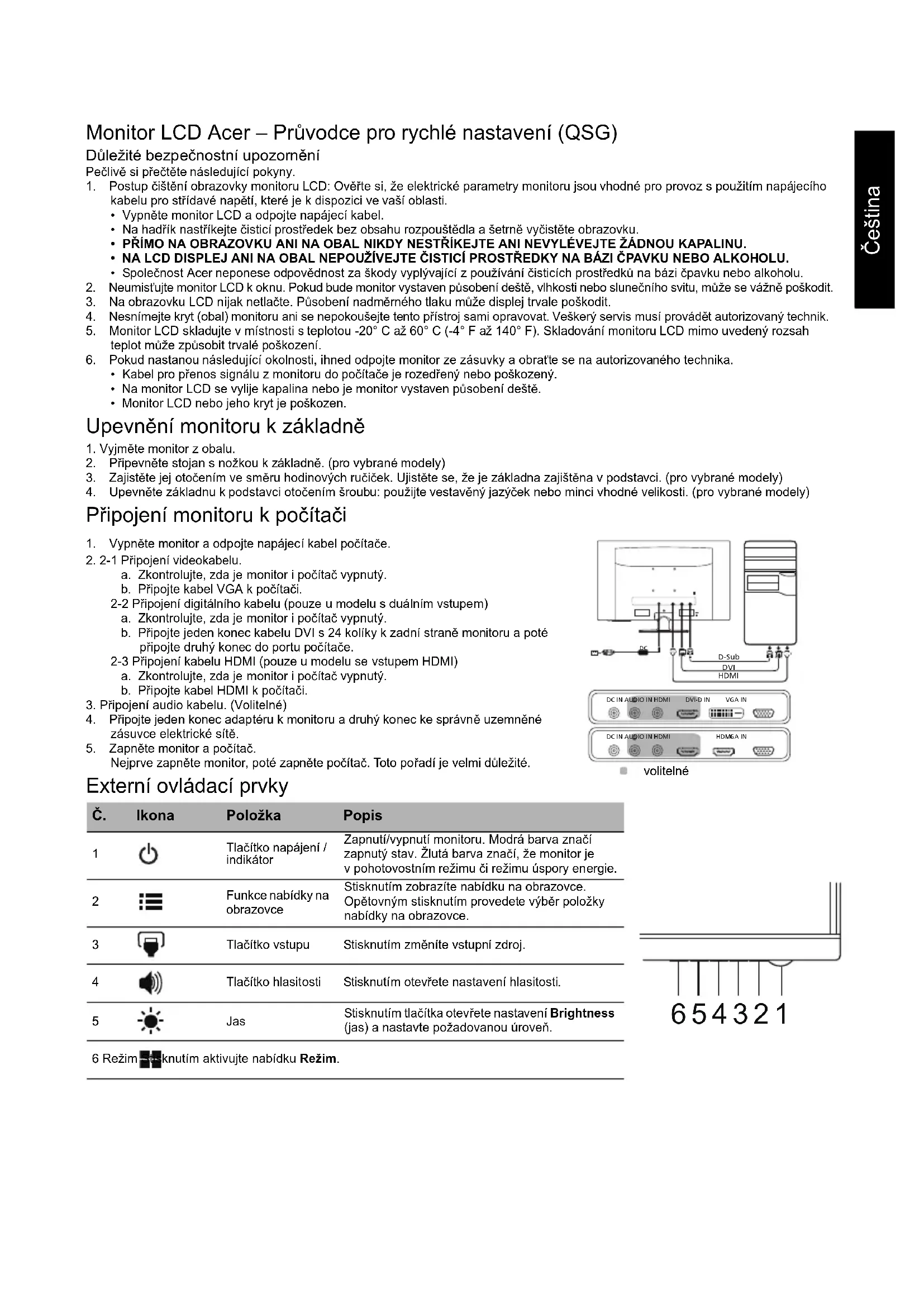 仕様は予告 な し に 変更 さ れ る こ と が あ り ま す。Čeština Monitor LCD Acer – Průvodce pro rychlé nastavení (QSG) Důležité bezpečnostní upozornění Pečlivě si přečtěte následující pokyny. 1. Postup čištění obrazovky monitoru LCD: Ověřte si, že elektrické parametry monitoru jsou vhodné pro provoz s použitím napájecího kabelu pro střídavé napětí, které je k dispozici ve vaší oblasti.