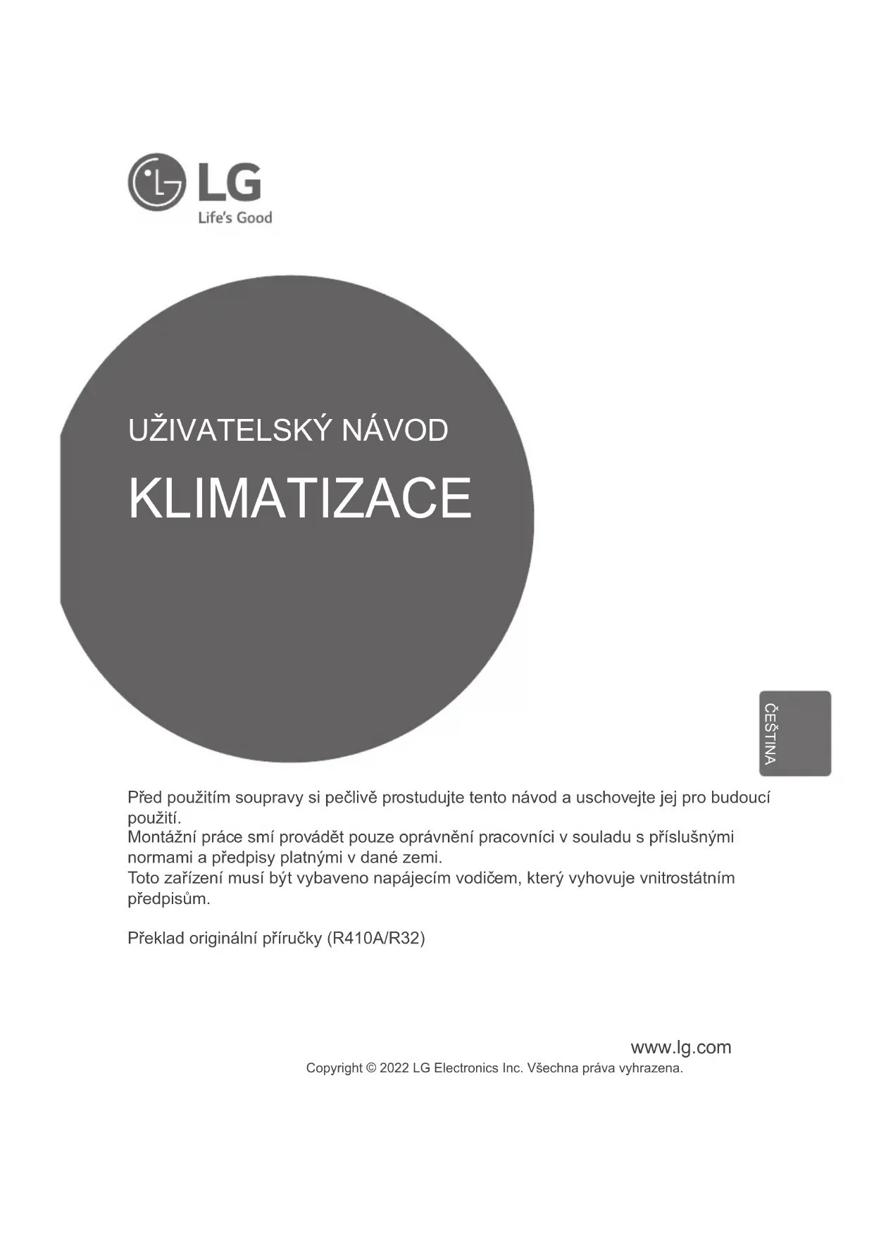 Před použitím soupravy si pečlivě prostudujte tento návod a uschovejte jej pro budoucí použití. Montážní práce smí provádět pouze oprávnění pracovníci v souladu s příslušnými normami a předpisy platnými v dané zemi. Toto zařízení musí být vybaveno napájecím vodičem, který vyhovuje vnitrostátním předpisům. Překlad originální příručky (R410A/R32) KLIMATIZACE Copyright © 2022 LG Electronics Inc. Všechna práva vyhrazena. ČEŠTINAObsah 2 Vnitřní jednotka