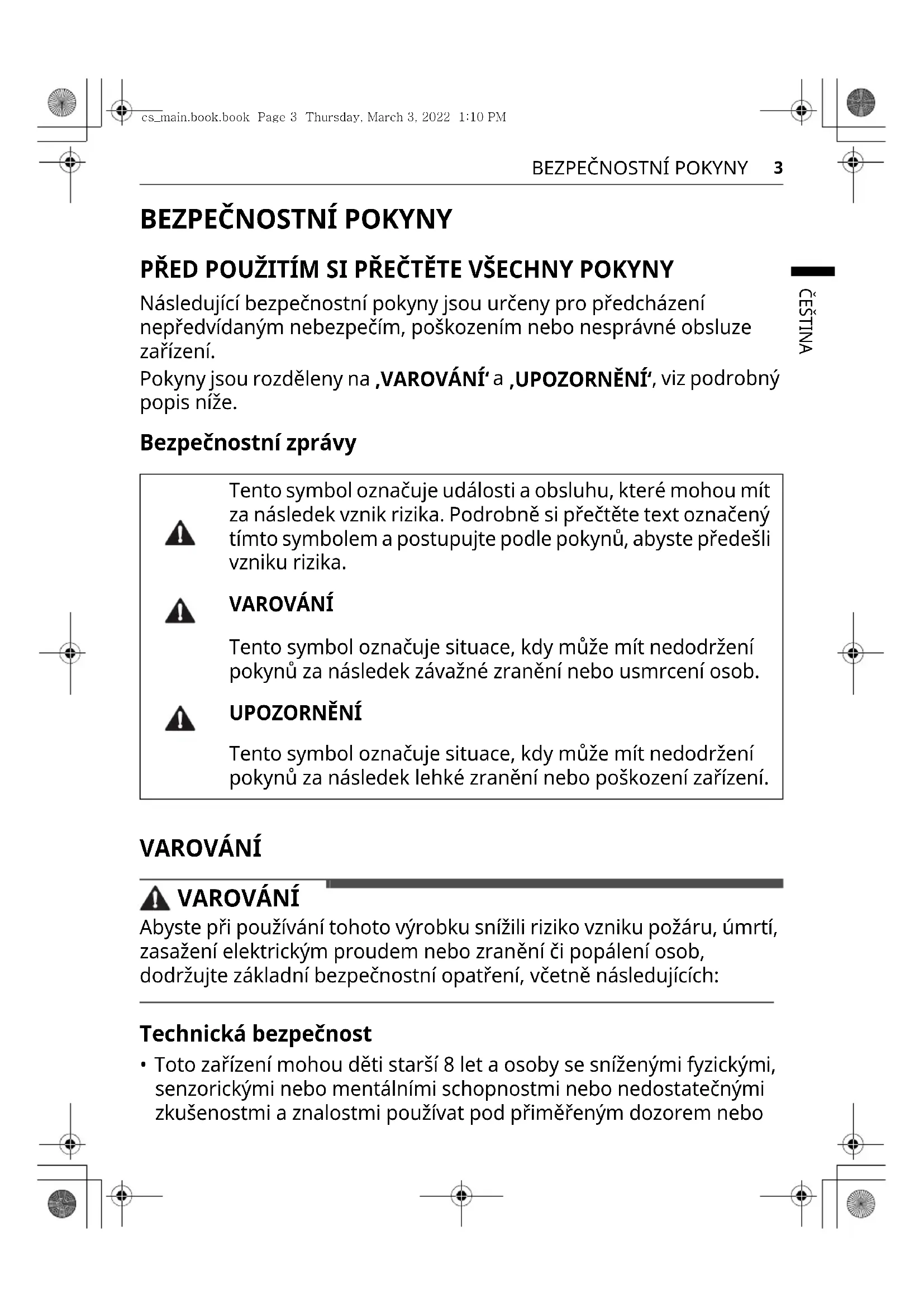 - Toto zařízení mohou děti starší 8 let a osoby se sníženými fyzickými, senzorickými nebo mentálními schopnostmi nebo nedostatečnými zkušenostmi a znalostmi používat pod přiměřeným dozorem nebo Tento symbol označuje události a obsluhu, které mohou mít za následek vznik rizika. Podrobně si přečtěte text označený tímto symbolem a postupujte podle pokynů, abyste předešli vzniku rizika. VAROVÁNÍ Tento symbol označuje situace, kdy může mít nedodržení pokynů za následek závažné zranění nebo usmrcení osob. UPOZORNĚNÍ Tento symbol označuje situace, kdy může mít nedodržení pokynů za následek lehké zranění nebo poškození zařízení. cs_main.book.book Page 3 Thursday, March 3, 2022 1:10 PM4
