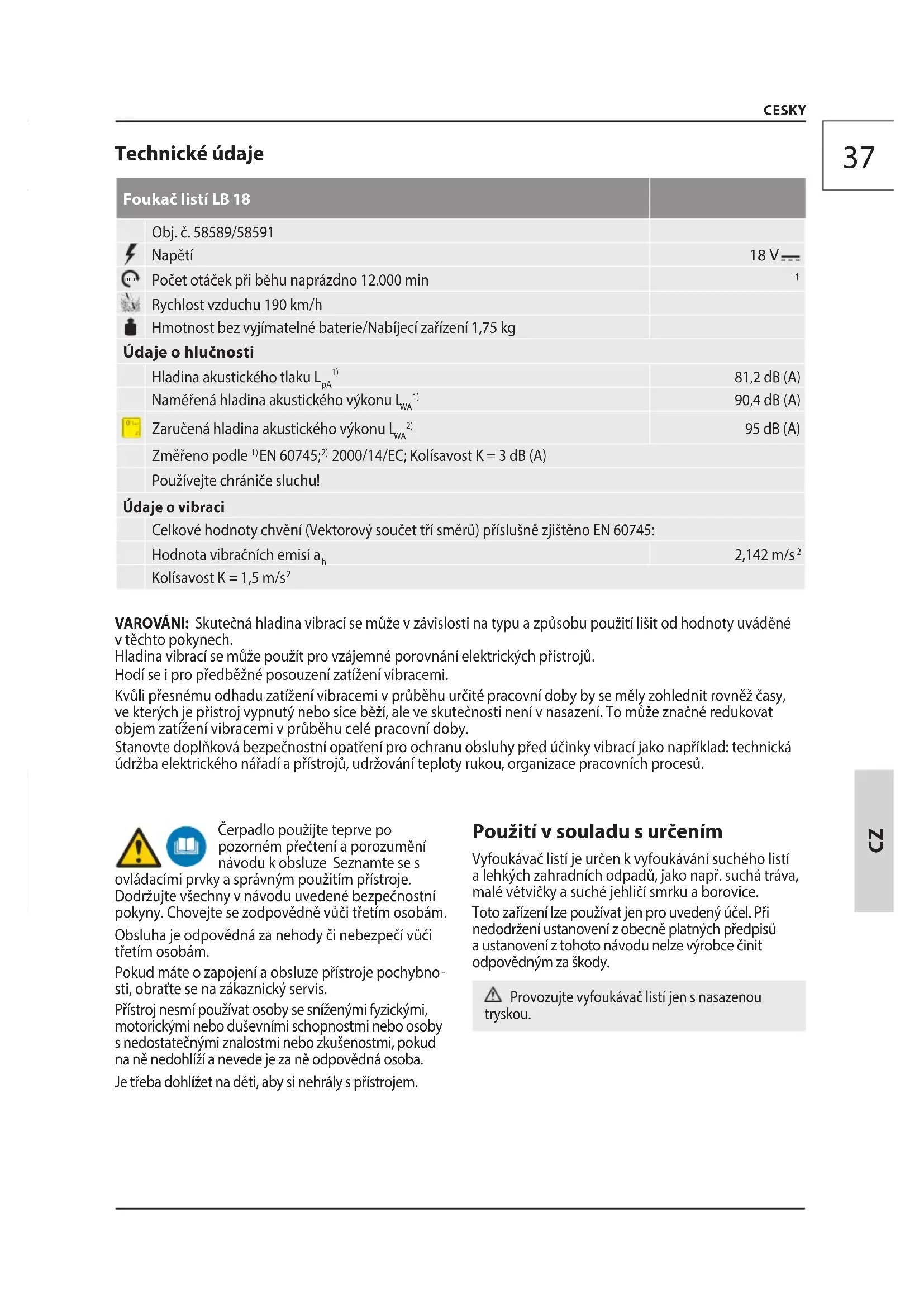 sti, obraťte se na zákaznický servis. Přístroj nesmí používat osoby se sníženými fyzickými, motorickými nebo duševními schopnostmi nebo osoby s nedostatečnými znalostmi nebo zkušenostmi, pokud na ně nedohlíží a nevede je za ně odpovědná osoba. Je třeba dohlížet na děti, aby si nehrály spřístrojem. Použití v souladu s určením Vyfoukávač listí je určen k vyfoukávání suchého listí a lehkých zahradních odpadů, jako např. suchá tráva, malé větvičky a suché jehličí smrku a borovice. Toto zařízení lze používat jen pro uvedený účel. Při nedodržení ustanovení z obecně platných předpisů a ustanovení z tohoto návodu nelze výrobce činit odpovědným za škody. Provozujte vyfoukávač listí jen s nasazenou tryskou. Technické údaje Foukač listí LB 18 Obj. č. 58589/58591 Napětí 18 V min Počet otáček při běhu naprázdno 12.000 min