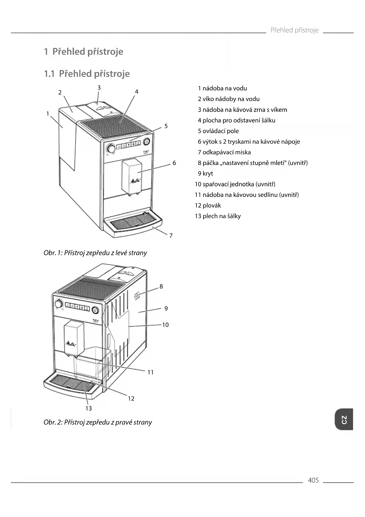 Obr. 2: Přístroj zepředu z pravé strany 1 nádoba na vodu 2 víko nádoby na vodu 3 nádoba na kávová zrna s víkem 4 plocha pro odstavení šálku 5 ovládací pole 6 výtok s 2 tryskami na kávové nápoje 7 odkapávací miska 8 páčka „nastavení stupně mletí“ (uvnitř) 9 kryt 10 spařovací jednotka (uvnitř) 11 nádoba na kávovou sedlinu (uvnitř) 12 plovák 13 plech na šálkyPřehled přístroje