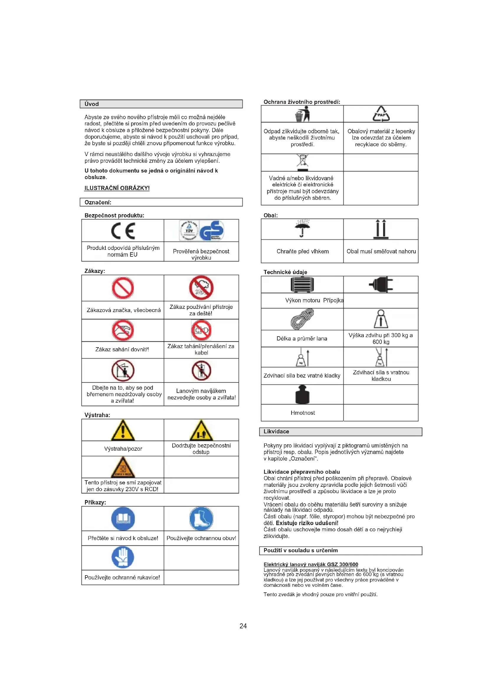 Pozor: Lanový naviják není vhodný pro dlouhodobý provoz a mĤže se proto po nČkolika provozních cyklech vypnout. PĜi prĤmyslovém použití podléhá pĜístroj, podle výnosu o provozní bezpeþnosti, odborné kontrole pĜed prvním uvedením do provozu. x Poškozené þásti nechte ihned vymČnit. x Nepodílejte se nikdy osobnČ na opravách (ztráta záruky a bezpeþnosti). x Lanový naviják nevystavujte zbyteþnČ povČtrnostním vlivĤm, sluneþnímu záĜení, prachu ani nízkým teplotám.