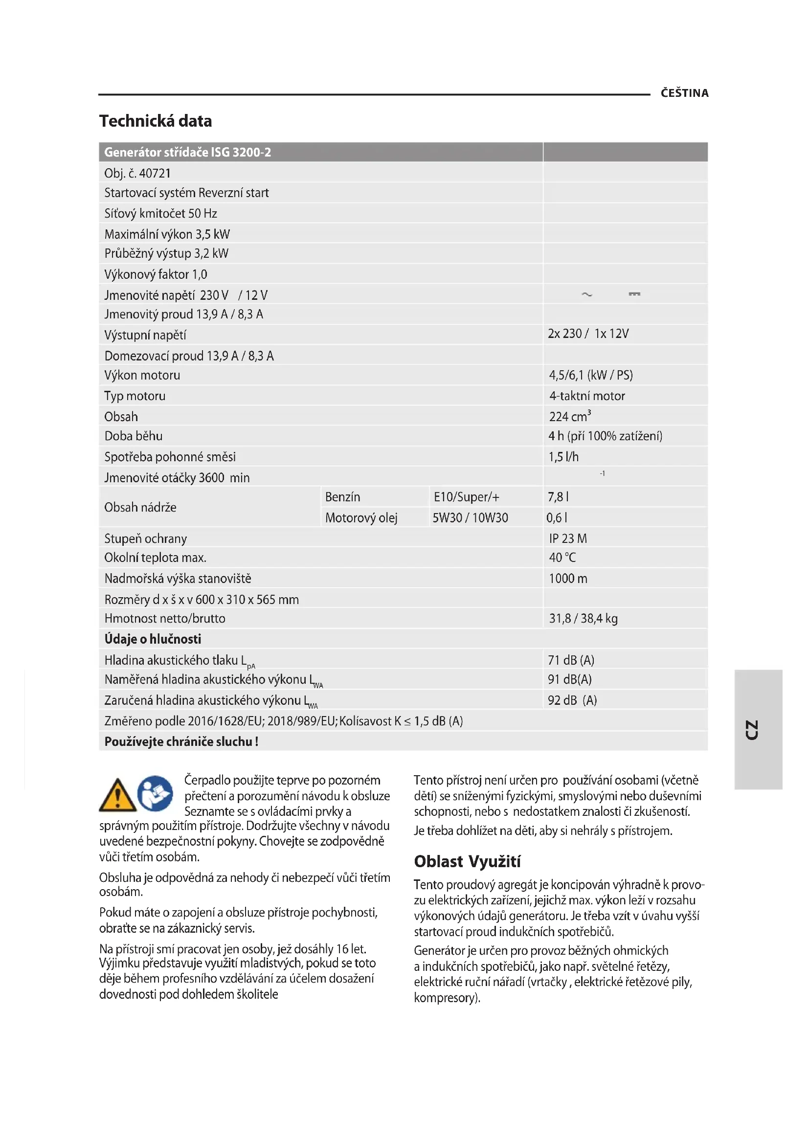 92 dB (A) Změřeno podle 2016/1628/EU; 2018/989/EU; Kolísavost K ≤ 1,5 dB (A) Používejte chrániče sluchu ! Čerpadlo použijte teprve po pozorném přečtení a porozumění návodu k obsluze Seznamte se s ovládacími prvky a správným použitím přístroje. Dodržujte všechny v návodu uvedené bezpečnostní pokyny. Chovejte se zodpovědně vůči třetím osobám. Obsluha je odpovědná za nehody či nebezpečí vůči třetím osobám. Pokud máte o zapojení a obsluze přístroje pochybnosti, obraťte se na zákaznický servis. Na přístroji smí pracovat jen osoby, jež dosáhly 16 let. Výjimku představuje využití mladistvých, pokud se toto děje během profesního vzdělávání za účelem dosažení dovednosti pod dohledem školitele Tento přístroj není určen pro používání osobami (včetně dětí) se sníženými fyzickými, smyslovými nebo duševními schopnosti, nebo s nedostatkem znalosti či zkušeností. Je třeba dohlížet na děti, aby si nehrály spřístrojem. Oblast Využití Tento proudový agregát je koncipován výhradně k provo- zu elektrických zařízení, jejichž max. výkon leží v rozsahu výkonových údajů generátoru. Je třeba vzít v úvahu vyšší startovací proud indukčních spotřebičů. Generátor je určen pro provoz běžných ohmických a indukčních spotřebičů, jako např. světelné řetězy, elektrické ruční nářadí (vrtačky , elektrické řetězové pily, kompresory). ČEŠTINA60 61
