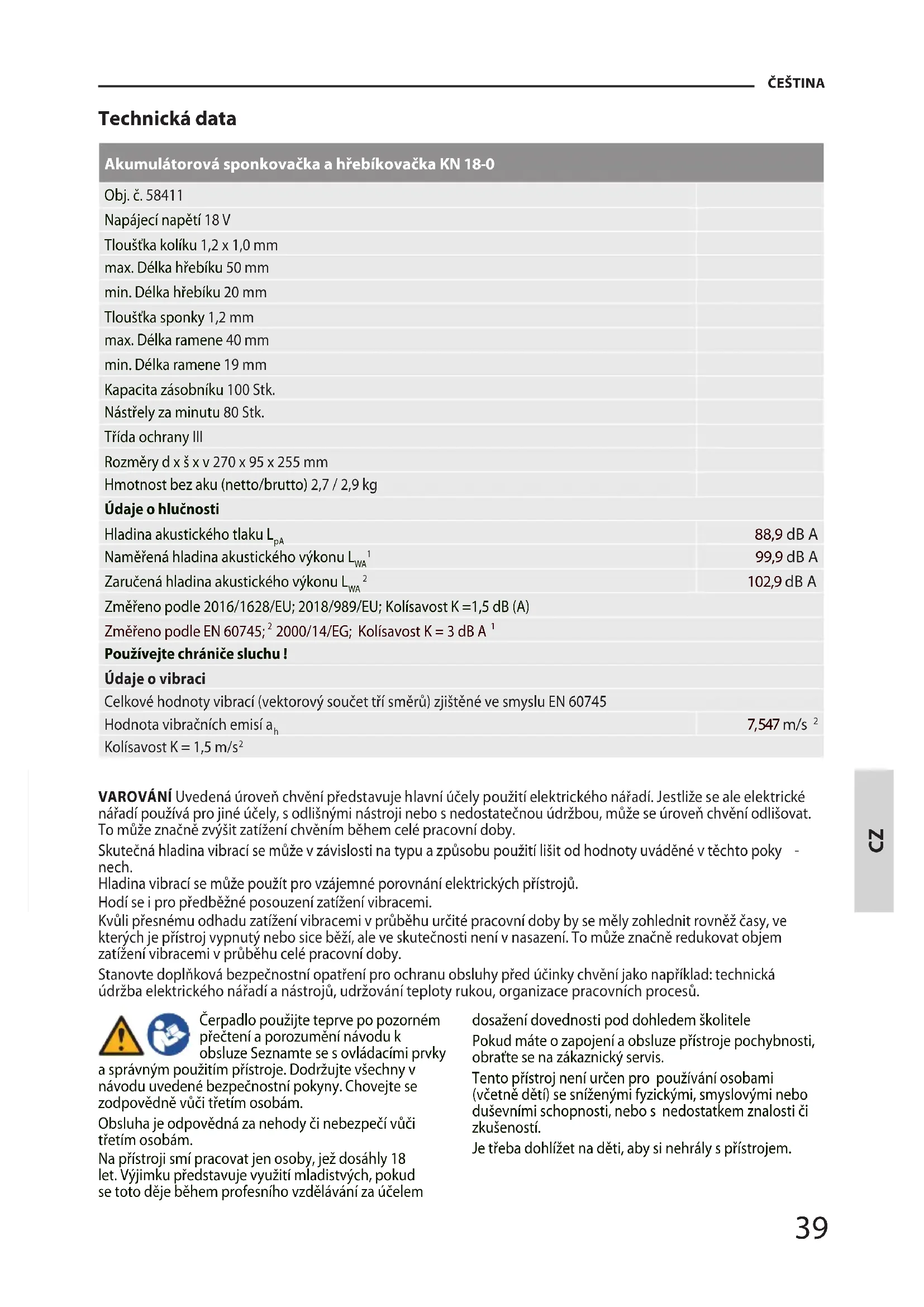 Technická data Akumulátorová sponkovačka a hřebíkovačka KN 18-0 Obj. č. 58411 Napájecí napětí 18 V Tloušťka kolíku 1,2 x 1,0 mm max. Délka hřebíku 50 mm min. Délka hřebíku 20 mm Tloušťka sponky 1,2 mm max. Délka ramene 40 mm min. Délka ramene 19 mm Kapacita zásobníku 100 Stk. Nástřely za minutu 80 Stk. Třída ochrany III Rozměry d x š x v 270 x 95 x 255 mm Hmotnost bez aku (netto/brutto) 2,7 / 2,9 kg Údaje o hlučnosti Hladina akustického tlaku L