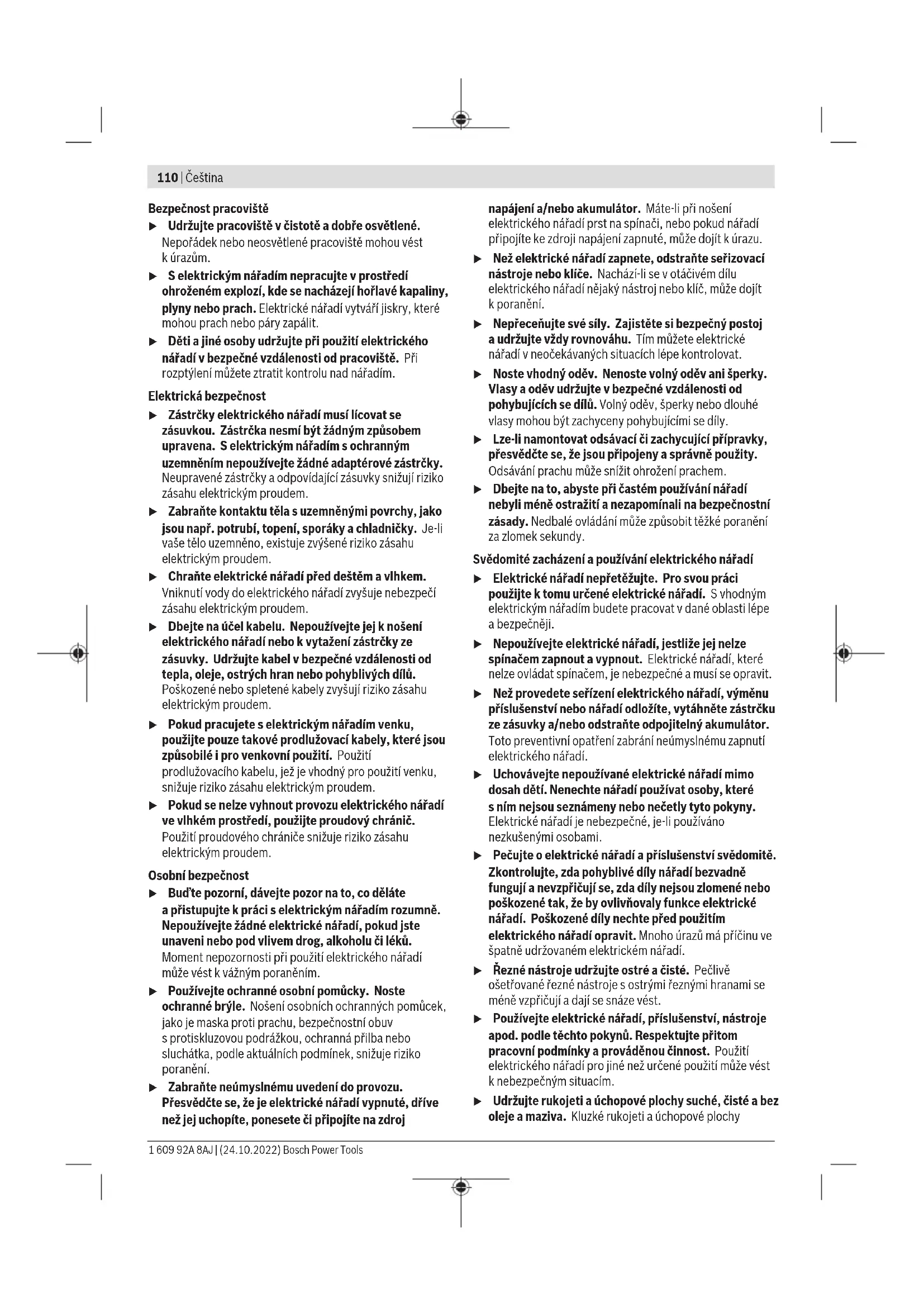 Low Energy Module GCY 30-4 posiada złącze radiowe. Należy wziąć pod uwagę obowiązujące lokalne ograniczenia dotyczące użytkowania, np. w samolotach lub szpita- lach. u Nie wolno przykładać włączonego elektronarzędzia do nakrętki/śruby. Obracające się narzędzia robocze mogą ześlizgnąć się z nakrętki lub z łba śruby. Po dłuższej pracy z niską prędkością obrotową elektronarzę- dzie należy schłodzić, przełączając je w tym celu na ok. 3 mi- nuty na maksymalną prędkość obrotową. Do wiercenia w metalu należy używać tylko ostrych wierteł HSS, znajdujących się w doskonałym stanie technicznym (HSS = stal szybkotnąca o podwyższonej wydajności skrawa- 1 609 92A 8AJ | (24.10.2022) Bosch Power ToolsČeština | 109 nia). Odpowiednią jakość gwarantuje program części za- miennych firmy Bosch. Przed wkręcaniem większych, dłuższych śrub w twarde ma- teriały, zaleca się wykonanie nawiercenia na ok. 2/3 długo- ści śruby, o średnicy równej średnicy gwintu śruby. Konserwacja i serwis Konserwacja i czyszczenie u Przed przystąpieniem do jakichkolwiek prac przy elektronarzędziu (np. prace konserwacyjne, wymiana osprzętu itp.), a także na czas transportu i przechowy- wania należy wyjąć z niego akumulator. Niezamierzone uruchomienie włącznika/wyłącznika grozi skaleczeniem. u Utrzymywanie urządzenia i szczelin wentylacyjnych w czystości gwarantuje prawidłową i bezpieczną pracę. Obsługa klienta oraz doradztwo dotyczące użytkowania Ze wszystkimi pytaniami, dotyczącymi naprawy ikonserwa- cji nabytego produktu oraz dostępu do części zamiennych, prosimy zwracać się do punktów obsługi klienta. Rysunki techniczne oraz informacje o częściach zamiennych można znaleźć pod adresem: www.bosch-pt.com Nasz zespół doradztwa dotyczącego użytkowania odpowie na wszystkie pytania związane z produktami firmy Bosch oraz ich osprzętem. Przy wszystkich zgłoszeniach oraz zamówieniach części za- miennych konieczne jest podanie 10‑cyfrowego numeru ka- talogowego, znajdującego się na tabliczce znamionowej pro- duktu. Polska Robert Bosch Sp. z o.o. Serwis Elektronarzędzi Ul. Jutrzenki 102/104 02-230 Warszawa Na www.serwisbosch.com znajdą Państwo wszystkie szcze- góły dotyczące usług serwisowych online. Tel.: 22 7154450 Faks: 22 7154440 E-Mail: bsc@pl.bosch.com www.bosch-pt.pl Pozostałe adresy serwisów znajdują się na stronie: www.bosch-pt.com/serviceaddresses Transport Zalecane akumulatory litowo-jonowe podlegają wymaganiom przepisów dotyczących towarów niebezpiecznych. Akumula- tory mogą być transportowane drogą lądową przez użytkow- nika, bez konieczności spełnienia jakichkolwiek dalszych wa- runków. W przypadku przesyłki przez osoby trzecie (np. transport drogą powietrzną lub za pośrednictwem firmy spedycyjnej) należy dostosować się do szczególnych wymogów dotyczą- cych opakowania i oznakowania towaru. W takim wypadku podczas przygotowywania towaru do wysyłki należy skonsul- tować się z ekspertem ds. towarów niebezpiecznych. Akumulatory można wysyłać tylko wówczas, gdy ich obudo- wa nie jest uszkodzona. Odsłonięte styki należy zakleić, a akumulator zapakować wtaki sposób, aby nie mógł on się poruszać (przesuwać) w opakowaniu. Należy wziąć też pod uwagę ewentualne inne przepisy prawa krajowego. Utylizacja odpadów Elektronarzędzia, akumulatory, osprzęt i opa- kowanie należy oddać do powtórnego przetwo- rzenia zgodnego z obowiązującymi przepisami w zakresie ochrony środowiska. Elektronarzędzia i akumulatora/baterii nie wol- no wyrzucać do odpadów domowych! Tylko dla krajów UE: Zgodnie z europejską dyrektywą 2012/19/UE w sprawie zu- żytego sprzętu elektrycznego i elektronicznego oraz jej trans- pozycją do prawa krajowego niezdatne do użytku elektrona- rzędzia, a zgodnie z europejską dyrektywą 2006/66/WE uszkodzone lub zużyte akumulatory/baterie należy zbierać osobno i doprowadzić do ponownego użycia zgodnie z obo- wiązującymi przepisami ochrony środowiska. W przypadku nieprawidłowej utylizacji zużyty sprzęt elek- tryczny i elektroniczny może mieć szkodliwe skutki dla śro- dowiska i zdrowia ludzkiego, wynikające z potencjalnej obec- ności substancji niebezpiecznych. Akumulatory/baterie: Li-Ion: Prosimy postępować zgodnie ze wskazówkami umieszczony- mi w rozdziale Transport (zob. „Transport“, Strona109). Čeština Bezpečnostní upozornění Obecné bezpečnostní pokyny pro elektrické nářadí VÝSTRAHA Prostudujte si všechny bezpečnostní výstrahy, pokyny, ilustrace aspecifikace ktomuto elektrickému nářadí. Nedodržování všech níže uvedených pokynů může mít za následek úraz elektrickým proudem, požár a/nebo těžké poranění. Všechna varovná upozornění apokyny do budoucna uschovejte. Vupozorněních použitý pojem „elektrické nářadí“ se vztahuje na elektrické nářadí napájené ze sítě (se síťovým kabelem) ana elektrické nářadí napájené akumulátorem (bez síťového kabelu). Bosch Power Tools 1 609 92A 8AJ | (24.10.2022)110 | Čeština Bezpečnost pracoviště u Udržujte pracoviště včistotě adobře osvětlené. Nepořádek nebo neosvětlené pracoviště mohou vést kúrazům. u Selektrickým nářadím nepracujte vprostředí ohroženém explozí, kde se nacházejí hořlavé kapaliny, plyny nebo prach. Elektrické nářadí vytváří jiskry, které mohou prach nebo páry zapálit. u Děti ajiné osoby udržujte při použití elektrického nářadí vbezpečné vzdálenosti od pracoviště. Při rozptýlení můžete ztratit kontrolu nad nářadím. Elektrická bezpečnost u Zástrčky elektrického nářadí musí lícovat se zásuvkou. Zástrčka nesmí být žádným způsobem upravena. Selektrickým nářadím sochranným uzemněním nepoužívejte žádné adaptérové zástrčky. Neupravené zástrčky aodpovídající zásuvky snižují riziko zásahu el