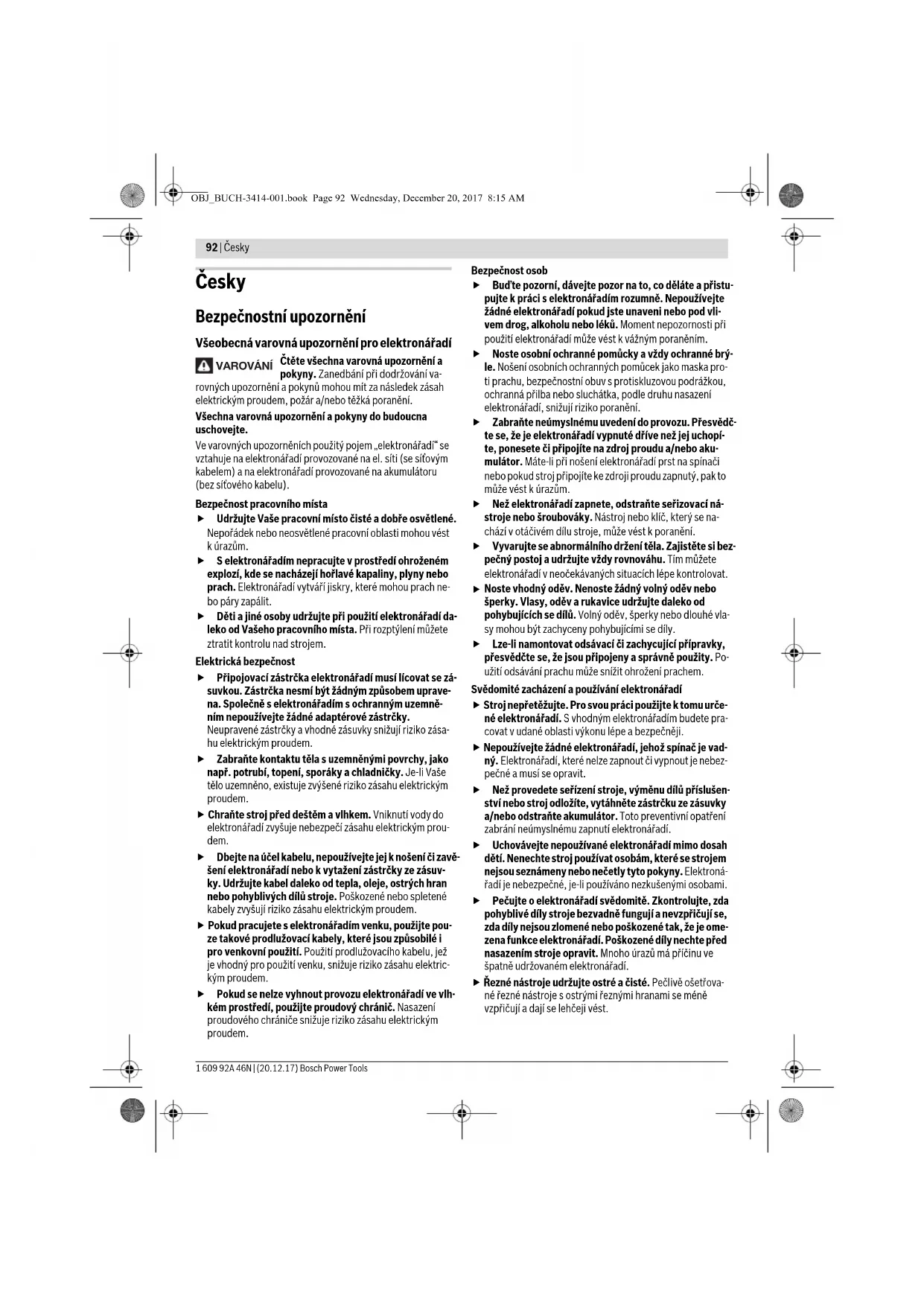Noste vhodný oděv. Nenoste žádný volný oděv nebo šperky. Vlasy, oděv a rukavice udržujte daleko od pohybujících se dílů. Volný oděv, šperky nebo dlouhé vla- sy mohou být zachyceny pohybujícími se díly. Lze-li namontovat odsávací či zachycující přípravky, přesvědčte se, že jsou připojeny a správně použity. Po- užití odsávání prachu může snížit ohrožení prachem. Svědomité zacházení a používání elektronářadí Stroj nepřetěžujte. Pro svou práci použijte k tomu urče- né elektronářadí. S vhodným elektronářadím budete pra- covat v udané oblasti výkonu lépe a bezpečněji. Nepoužívejte žádné elektronářadí, jehož spínač je vad- ný. Elektronářadí, které nelze zapnout či vypnout je nebez- pečné a musí se opravit. Než provedete seřízení stroje, výměnu dílů příslušen- ství nebo stroj odložíte, vytáhněte zástrčku ze zásuvky a/nebo odstraňte akumulátor. Toto preventivní opatření zabrání neúmyslnému zapnutí elektronářadí. Uchovávejte nepoužívané elektronářadí mimo dosah dětí. Nenechte stroj používat osobám, které se strojem nejsou seznámeny nebo nečetly tyto pokyny. Elektroná- řadí je nebezpečné, je-li používáno nezkušenými osobami. Pečujte o elektronářadí svědomitě. Zkontrolujte, zda pohyblivé díly stroje bezvadně fungují a nevzpřičují se, zda díly nejsou zlomené nebo poškozené tak, že je ome- zena funkce elektronářadí. Poškozené díly nechte před nasazením stroje opravit. Mnoho úrazů má příčinu ve špatně udržovaném elektronářadí. Řezné nástroje udržujte ostré a čisté. Pečlivě ošetřova- né řezné nástroje s ostrými řeznými hranami se méně vzpřičují a dají se lehčeji vést. VAROVÁNÍ OBJ_BUCH-3414-001.book Page 92 Wednesday, December 20, 2017 8:15 AMČesky | 93 Bosch Power Tools 1 609 92A 46N | (20.12.17) Používejte elektronářadí, příslušenství, nasazovací ná- stroje apod. podle těchto pokynů. Respektujte přitom pracovní podmínky a prováděnou činnost. Použití elek- tronářadí pro jiné než určující použití může vést k nebez- pečným situacím. Servis Nechte Vaše elektronářadí opravit pouze kvalifikova- ným odborným personálem a pouze s originálními ná- hradními díly. Tím bude zajištěno, že bezpečnost stroje zůstane zachována. Bezpečnostní upozornění pro přímé brusky Společná bezpečnostní upozornění k broušení a práci s drátěnými kartáči Toto elektronářadí se používá jako bruska a drátěný kartáč. Dbejte všech bezpečnostních upozornění, po- kynů, vyobrazení a dat, která obdržíte s elektronářa- dím. Když nebudete respektovat následující pokyny, může dojít k zásahu elektrickým proudem, ohni nebo k těžkým zraněním. Toto elektronářadí není vhodné k broušení brusným papírem, leštění a oddělování. Použití, pro která není elektronářadí určeno, mohou způsobit ohrožení a zranění. Nepoužívejte žádné příslušenství, které není výrobcem speciálně pro toto elektronářadí určeno a doporučeno. Pouze to, že můžete příslušenství na Vaše elektronářadí upevnit, nezaručuje bezpečné použití. Dovolený počet otáček nasazovacího nástroje musí být minimálně tak vysoký, jako na elektronářadí uvedený nejvyšší počet otáček. Příslušenství, jež se otáčí rychleji než je dovoleno, se může rozlomit a rozletět. Vnější rozměr a tloušťka nasazovacího nástroje musí odpovídat rozměrovým údajům Vašeho elektronářadí. Špatně dimenzované nasazovací nástroje nemohou být dostatečně stíněny nebo kontrolovány. Nasazovací nástroje se závitovou vložkou musejí přes- ně lícovat na závit brusného vřetene. U nasazovacích nástrojů, jež jsou montované prostřednictvím příruby, musí průměr otvoru nasazovacího nástroje lícovat na upínací průměr příruby. Nasazovací nástroje, které nej- sou na elektronářadí upevněné přesně, se nerovnoměrně otáčejí, velmi silně vibrují a mohou vést ke ztrátě kontroly. Nepoužívejte žádné poškozené nasazovací nástroje. Zkontrolujte před každým použitím nasazovací nástro- je jako brusné kotouče na odštěpky a trhliny, brusné ta- líře na trhliny, otěr nebo silné opotřebení, drátěné kar- táče na uvolněné nebo zlomené dráty. Spadne-li elektronářadí nebo nasazovací nástroj z výšky, zkont- rolujte zda není poškozený nebo použijte nepoškozený nasazovací nástroj. Pokud jste nasazovací nástroj zkontrolovali a nasadili, držte se Vy a v blízkosti nachá- zející se osoby mimo rovinu rotujícího nasazovacího nástroje a nechte stroj běžet jednu minutu s nejvyššími otáčkami. Poškozené nasazovací nástroje většinou v této době testování prasknou. Noste osobní ochranné vybavení. Podle aplikace pou- žijte ochranu celého obličeje, ochranu očí nebo ochran- né brýle. Taktéž adekvátně noste ochrannou masku proti prachu, ochranu sluchu, ochranné rukavice nebo speciální zástěru, jež Vás ochrání před malými částice- mi brusiva a materiálu. Oči mají být chráněny před odle- tujícími cizími tělísky, jež vznikají při různých aplikacích. Protiprachová maska či respirátor musejí při používání vznikající prach odfiltrovat. Pokud jste dlouho vystaveni silnému hluku, můžete utrpět ztrátu sluchu. Dbejte u ostatních osob na bezpečnou vzdálenost k Va- ší pracovní oblasti. Každý, kdo vstoupí do této pracovní oblasti, musí nosit osobní ochranné vybavení. Úlomky obrobku nebo ulomených nasazovacích nástrojů mohou odlétnout a způsobit poranění i mimo přímou pracovní ob- last. Pokud provádíte práce, při kterých může nástroj zasáh- nout skrytá elektrická vedení nebo vlastní přívodní ka- bel, držte nářadí 