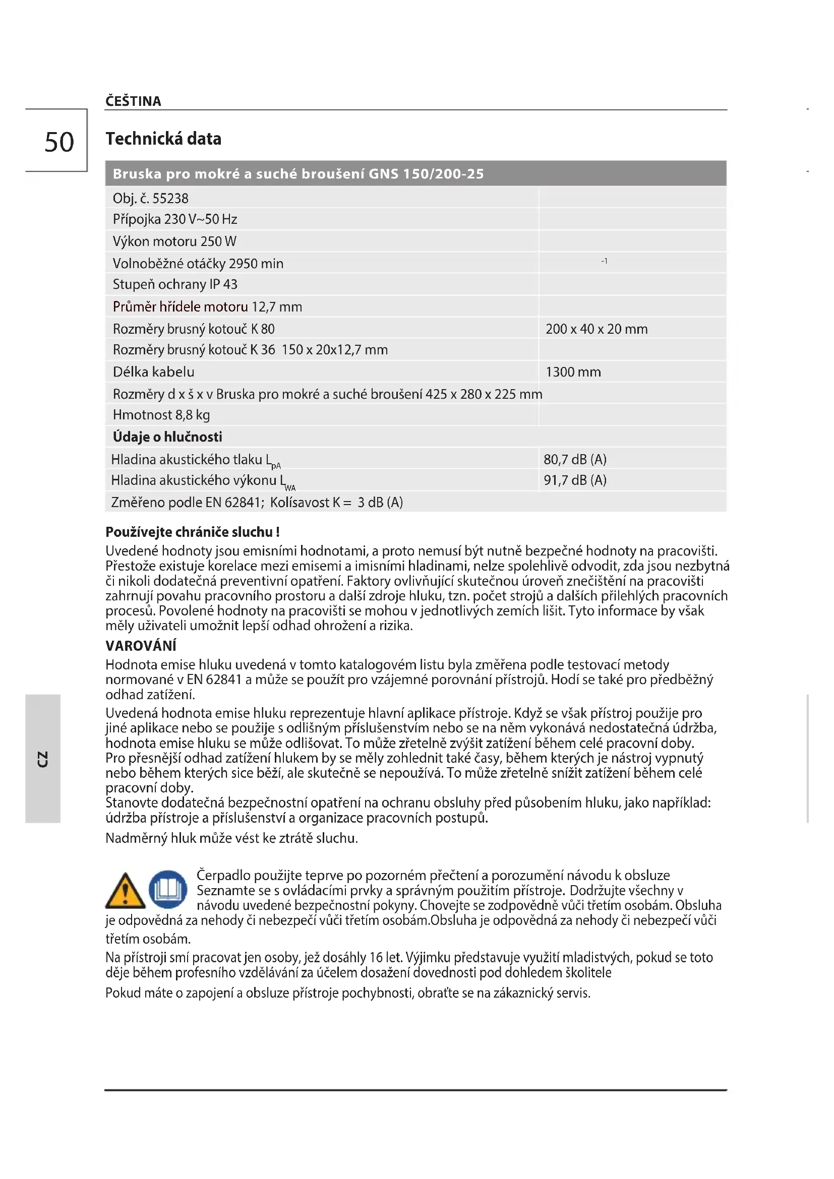 Technická data Bruska pro mokré a suché broušení GNS 150/200-25 Obj. č. 55238 Přípojka 230 V~50 Hz Výkon motoru 250 W Volnoběžné otáčky 2950 min