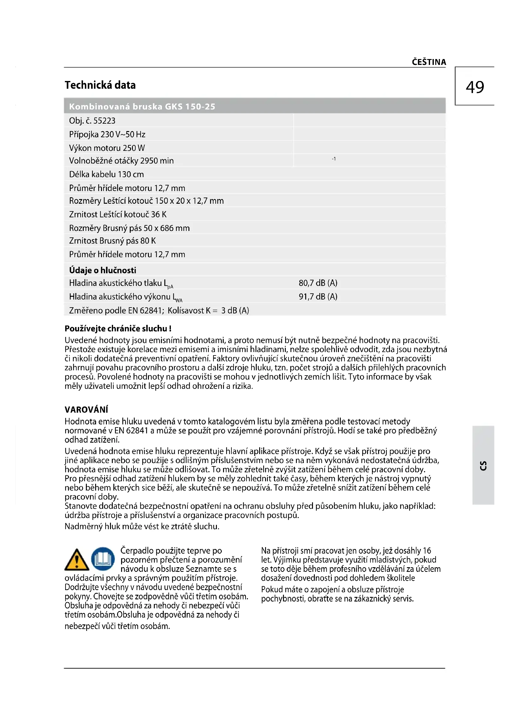 Technická data Kombinovaná bruska GKS 150-25 Obj. č. 55223 Přípojka 230 V~50 Hz Výkon motoru 250 W Volnoběžné otáčky 2950 min