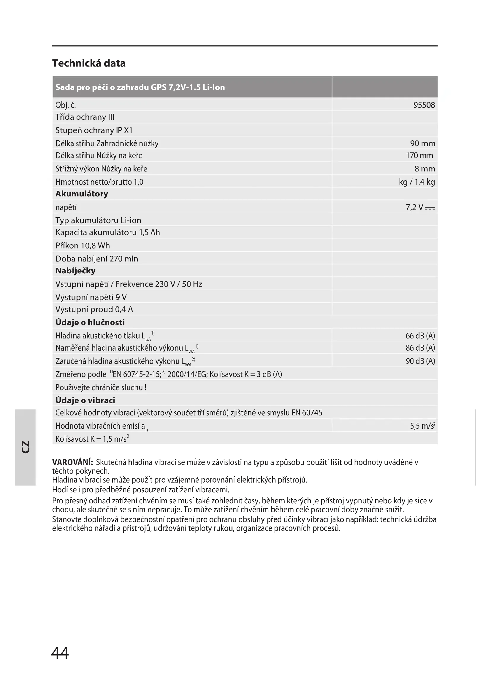 Třída ochrany III Stupeň ochrany IP X1 Délka střihu Zahradnické nůžky 90 mm Délka střihu Nůžky na keře 170 mm Střižný výkon Nůžky na keře 8 mm Hmotnost netto/brutto 1,0 kg / 1,4