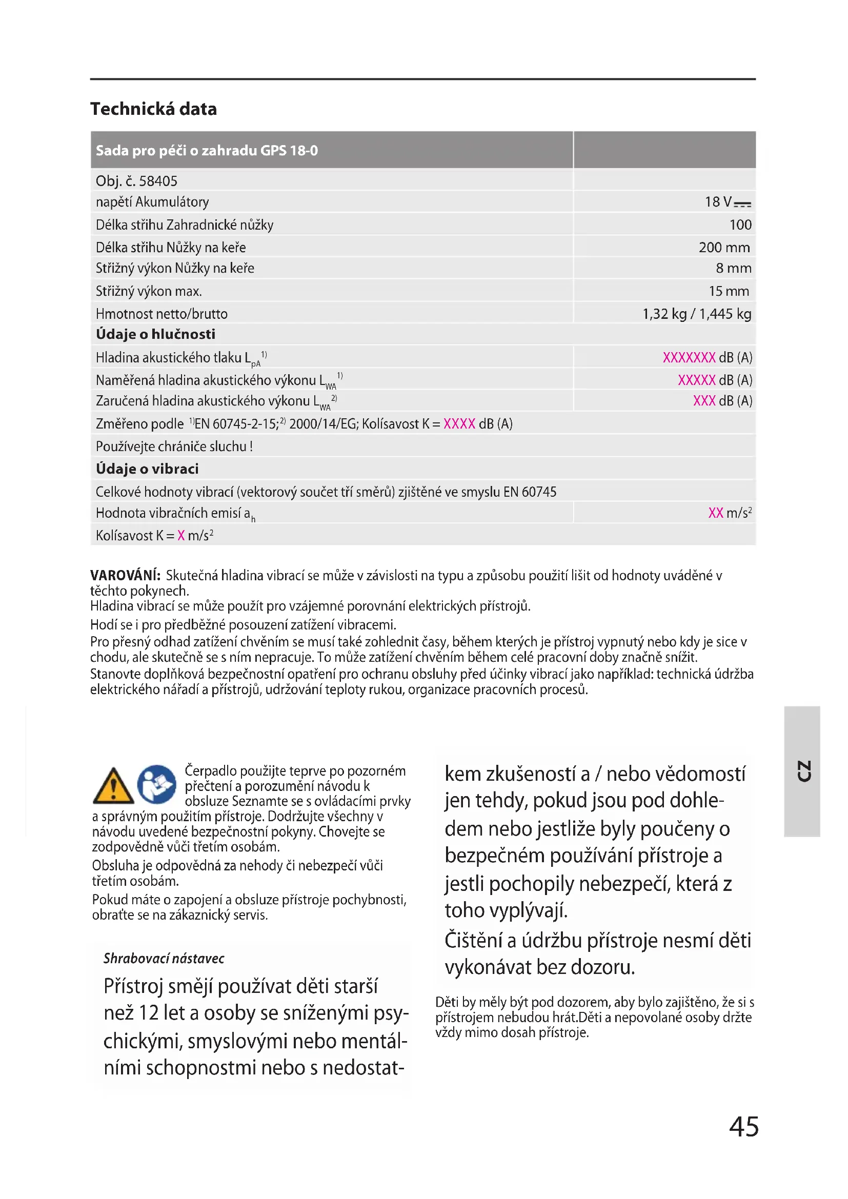 VAROVÁNÍ: Skutečná hladina vibrací se může v závislosti na typu a způsobu použití lišit od hodnoty uváděné v těchto pokynech. Hladina vibrací se může použít pro vzájemné porovnání elektrických přístrojů. Hodí se i pro předběžné posouzení zatížení vibracemi. Pro přesný odhad zatížení chvěním se musí také zohlednit časy, během kterých je přístroj vypnutý nebo kdy je sice v chodu, ale skutečně se s ním nepracuje. To může zatížení chvěním během celé pracovní doby značně snížit. Stanovte doplňková bezpečnostní opatření pro ochranu obsluhy před účinky vibrací jako například: technická údržba elektrického nářadí a přístrojů, udržování teploty rukou, organizace pracovních procesů. Čerpadlo použijte teprve po pozorném přečtení a porozumění návodu k obsluze Seznamte se s ovládacími prvky a správným použitím přístroje. Dodržujte všechny v návodu uvedené bezpečnostní pokyny. Chovejte se zodpovědně vůči třetím osobám. Obsluha je odpovědná za nehody či nebezpečí vůči třetím osobám. Pokud máte o zapojení a obsluze přístroje pochybnosti, obraťte se na zákaznický servis. Shrabovací nástavec Přístroj smějí používat děti starší než 12 let a osoby se sníženými psy- chickými, smyslovými nebo mentál- ními schopnostmi nebo s nedostat- kem zkušeností a / nebo vědomostí jen tehdy, pokud jsou pod dohle- dem nebo jestliže byly poučeny o bezpečném používání přístroje a jestli pochopily nebezpečí, která z toho vyplývají. Čištění a údržbu přístroje nesmí děti vykonávat bez dozoru. Děti by měly být pod dozorem, aby bylo zajištěno, že si s přístrojem nebudou hrát.Děti a nepovolané osoby držte vždy mimo dosah přístroje. CZ46