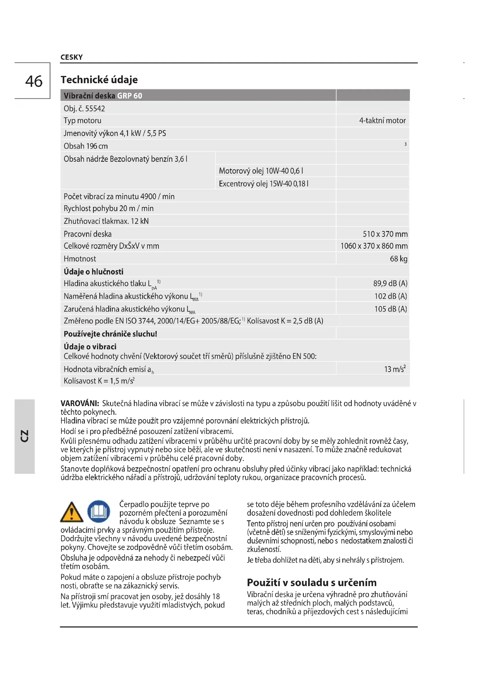 nosti, obraťte se na zákaznický servis. Na přístroji smí pracovat jen osoby, jež dosáhly 18 let. Výjimku představuje využití mladistvých, pokud se toto děje během profesního vzdělávání za účelem dosažení dovednosti pod dohledem školitele Tento přístroj není určen pro používání osobami (včetně dětí) se sníženými fyzickými, smyslovými nebo duševními schopnosti, nebo s nedostatkem znalosti či zkušeností. Je třeba dohlížet na děti, aby si nehrály spřístrojem. Použití v souladu s určením Vibrační deska je určena výhradně pro zhutňování malých až středních ploch, malých podstavců, teras, chodníků a příjezdových cest s následujícími47 CESKY