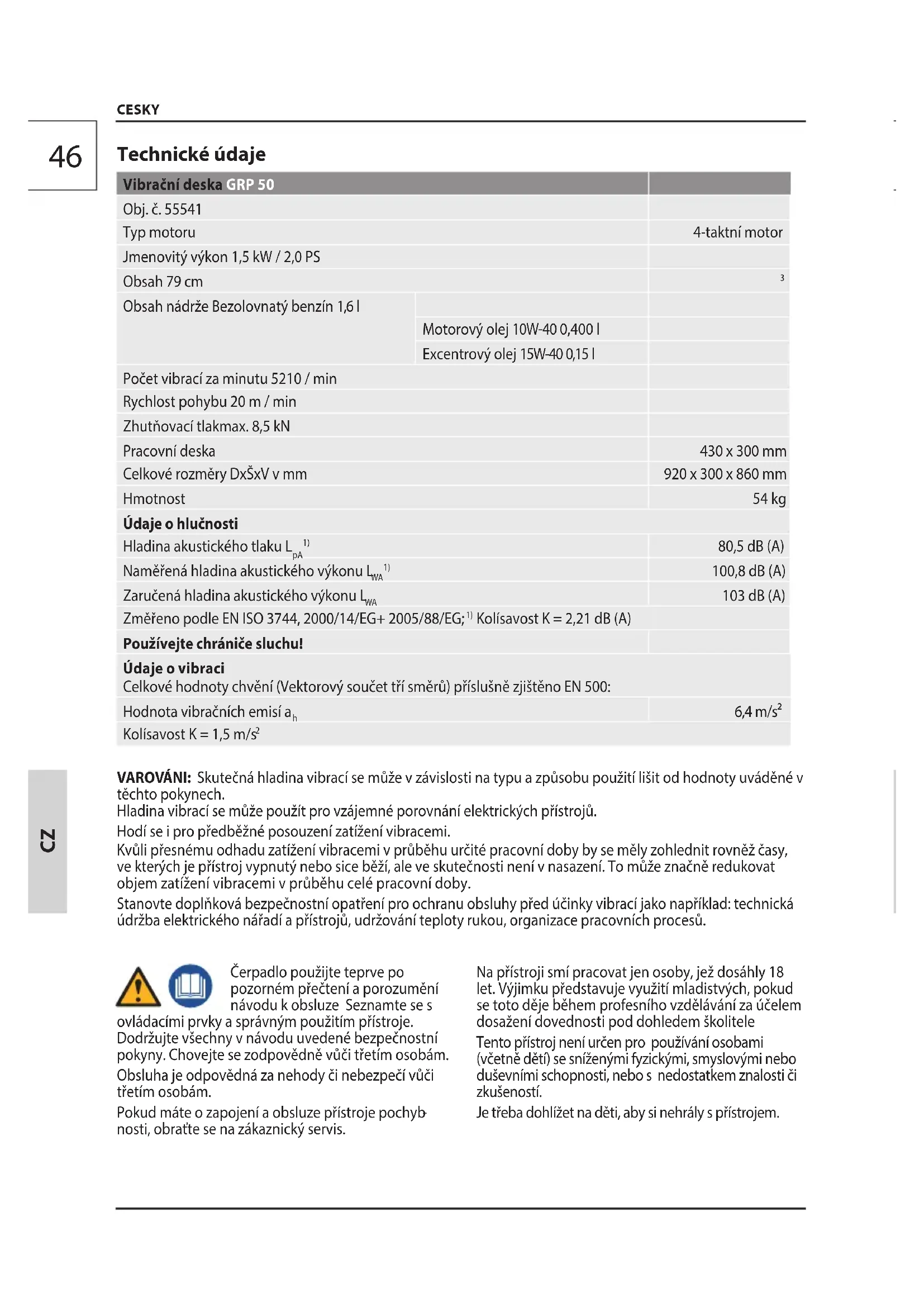 Obsah nádrže Bezolovnatý benzín 1,6 l Motorový olej 10W-40 0,400 l Excentrový olej 15W-40 0,15 l Počet vibrací za minutu 5210 / min Rychlost pohybu 20 m / min Zhutňovací tlakmax. 8,5 kN Pracovní deska 430 x 300 mm Celkové rozměry DxŠxV v mm 920 x 300 x 860 mm Hmotnost 54 kg Údaje o hlučnosti Hladina akustického tlaku L