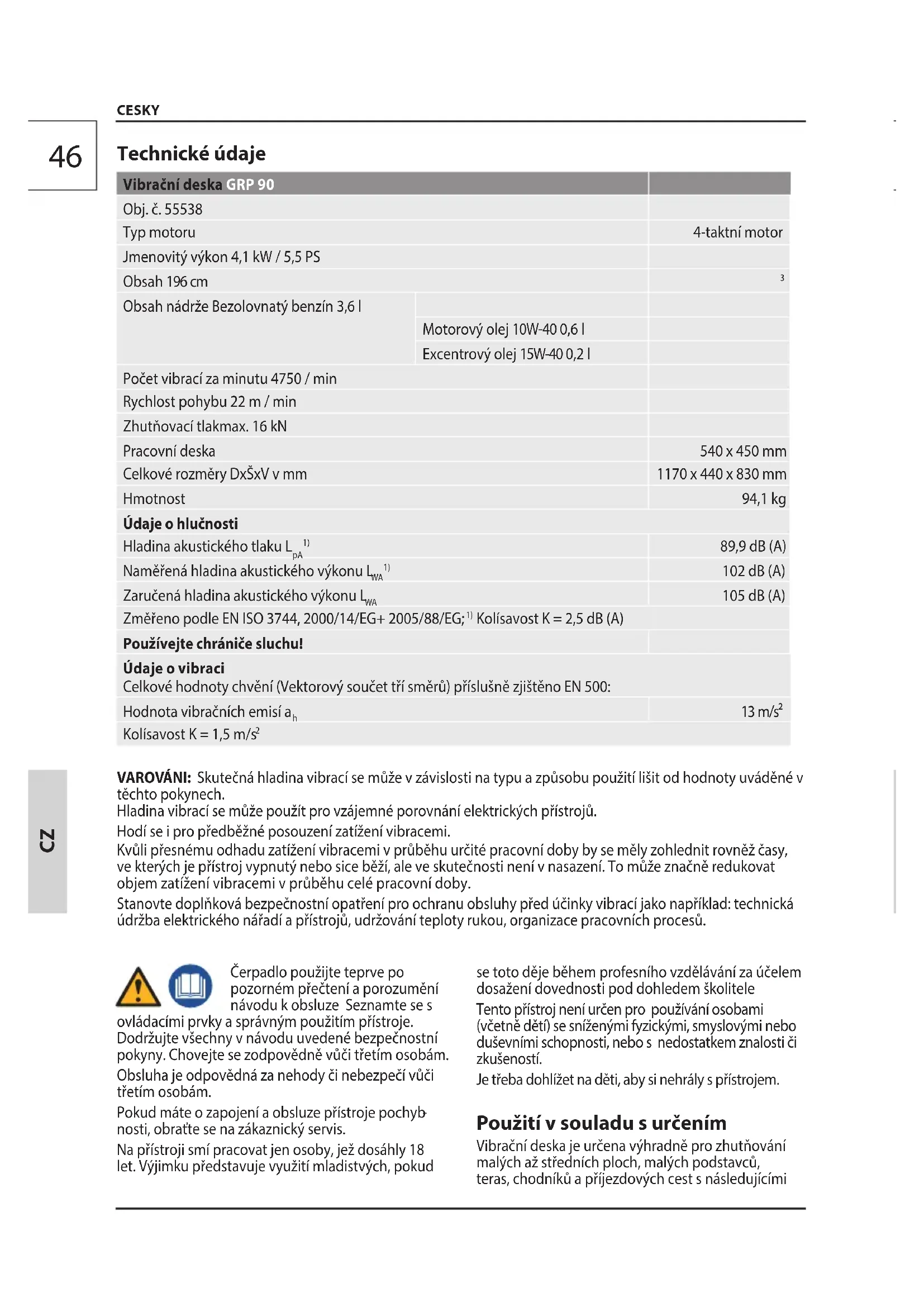 Technické údaje Vibrační deska GRP 90 Obj. č. 55538 Typ motoru 4-taktní motor Jmenovitý výkon 4,1 kW / 5,5 PS Obsah 196 cm