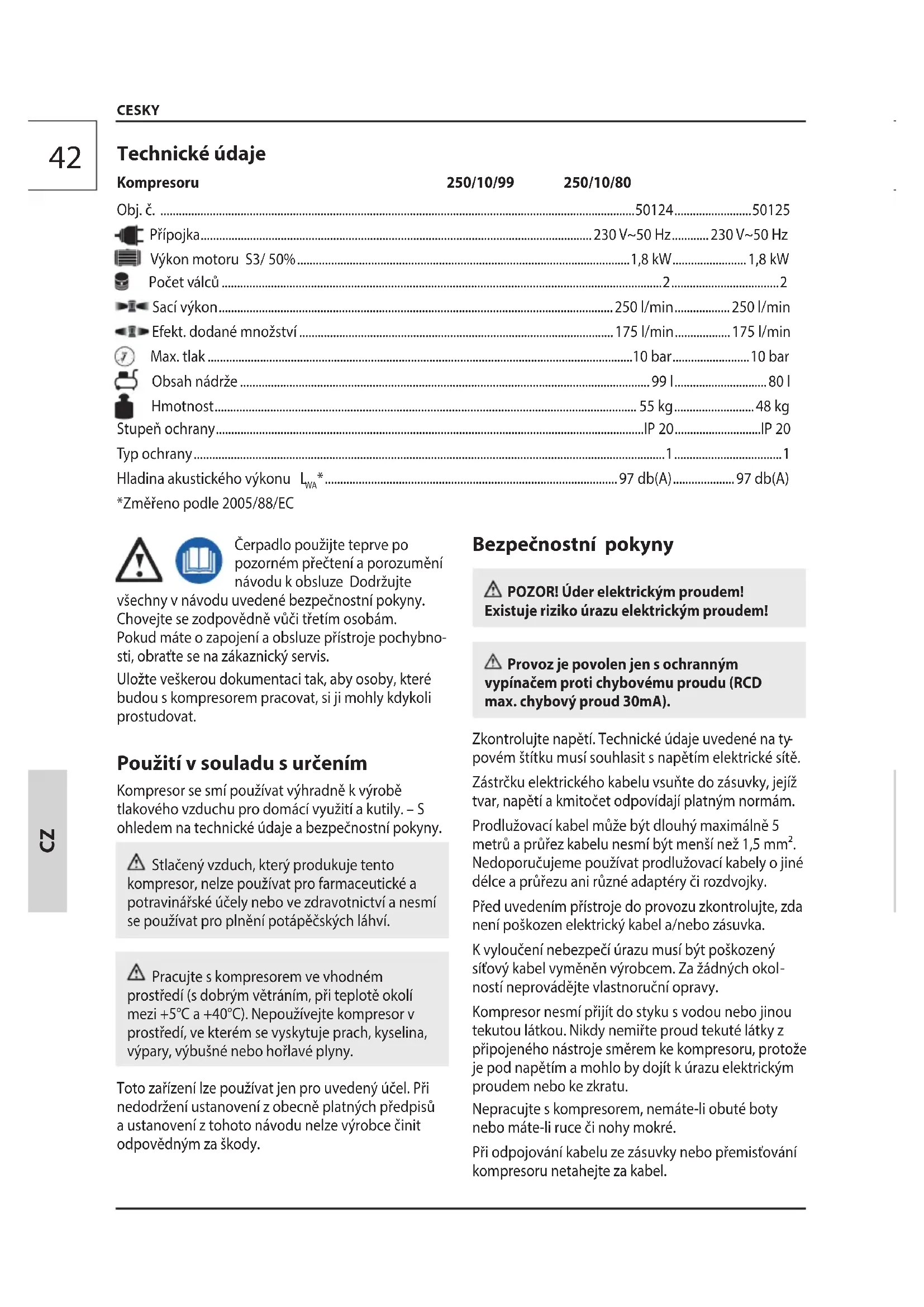 - ...............................................................................................97 db(A) ....................97 db(A) *Změřeno podle 2005/88/EC Technické údaje Kompresoru 250/10/99 250/10/8043 Tento kompresor je vyroben tak, aby fungoval přerušovaně v poměru uvedeném na štítku s tech- nickými údaji (např. značka S3-25 znamená 2,5 minuty provozu a 7,5 minut přestávky), aby nedocházelo k přehřátí elektromotoru. Motor je vybaven tepelnou ochranou a pokud by došlo k přílišnému zvýšení teploty, tato ochrana by automaticky přerušila přívod elektrického proudu. Po návratu na normální teplotu se motor spustí automaticky. Pozor! Kompresor nikdy nezapínejte resp. nevypínejte pomocí zástrčky. Vždy stiskněte tlakový spínač. Kompresor nenechávejte zapnutý přes noc, mohl by se stát zdrojem nebezpečí. Na konci pracovního dne vypněte vždy na zapínači/ vypínači, vypusťte vzdušník a kompresor odpojte ze sítě. Pozor: nevypuštěná kondenzovaná voda může být příčinou koroze uvnitř nádrže a omezit tak její výkonnost a ohrozit bezpečnost. Nenechávejte kompresor vystavený atmosférickým vlivům (déšť, slunce, mlha, sníh). Pokud budete kompresor používat venku, nezapomeňte je po použití vždy uložit na kryté nebo uzavřené místo. Kompresor nikdy nepoužívejte venku v dešti nebo za jiných nepříznivých meteorologických podmínek. Do blízkosti kompresoru nebo na kompresor nepo