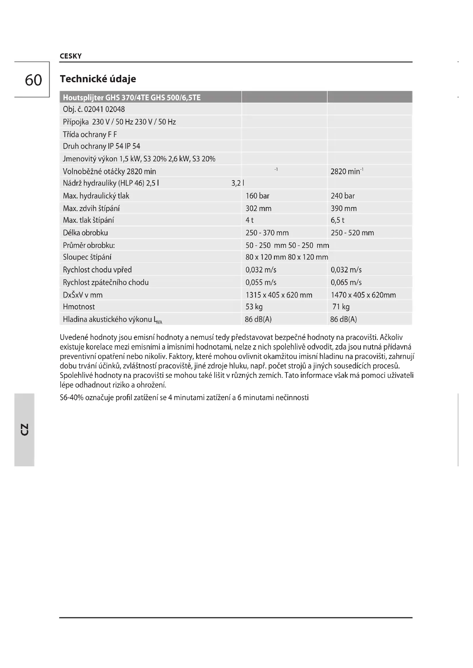 CESKY Technické údaje Houtsplijter GHS 370/4TE GHS 500/6,5TE Obj. č. 02041 02048 Přípojka 230 V / 50 Hz 230 V / 50 Hz Třída ochrany F F Druh ochrany IP 54 IP 54 Jmenovitý výkon 1,5 kW, S3 20% 2,6 kW, S3 20% Volnoběžné otáčky 2820 min