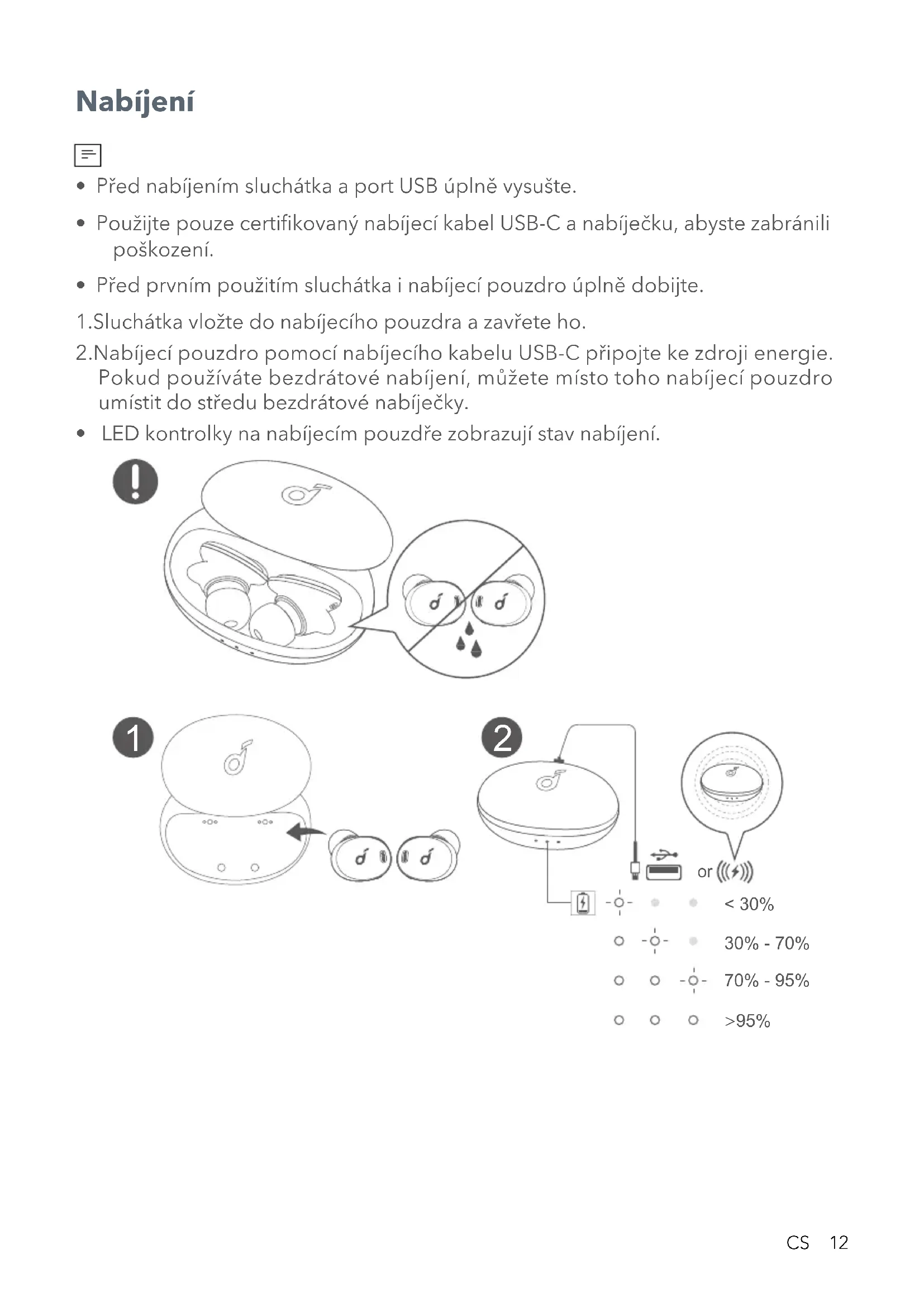 - Před prvním použitím sluchátka i nabíjecí pouzdro úplně dobijte. 1.Sluchátka vložte do nabíjecího pouzdra a zavřete ho. 2.Nabíjecí pouzdro pomocí nabíjecího kabelu USB-C připojte ke zdroji energie. Pokud používáte bezdrátové nabíjení, můžete místo toho nabíjecí pouzdro umístit do středu bezdrátové nabíječky.