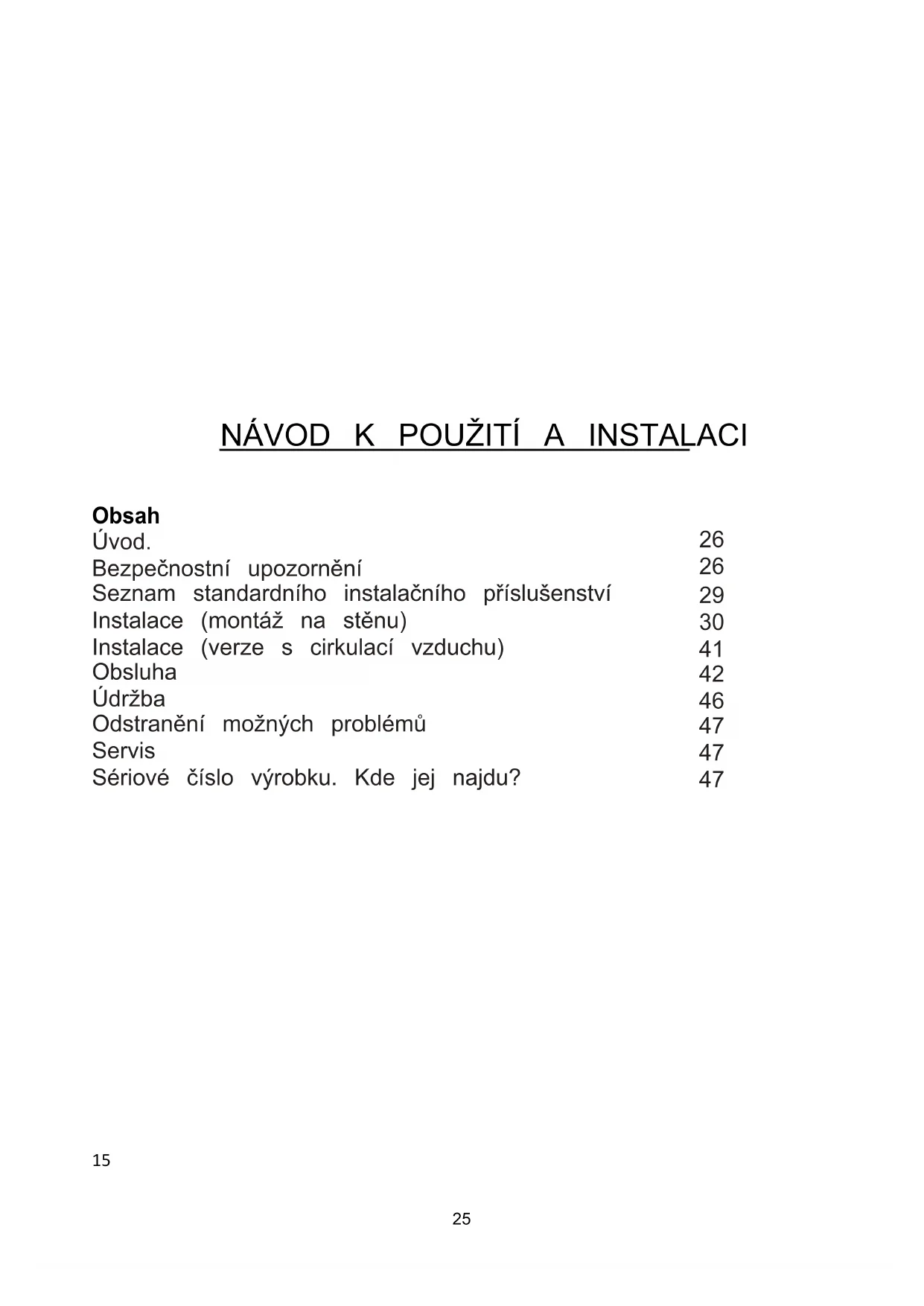 NÁVOD K POUŽITÍ A INSTALACI Obsah Úvod. Bezpečnostní upozornění Seznam standardního instalačního příslušenství Instalace (montáž na stěnu) Instalace (verze s cirkulací vzduchu) Obsluha Údržba Odstranění možných problémů Servis Sériové číslo výrobku. Kde jej najdu?