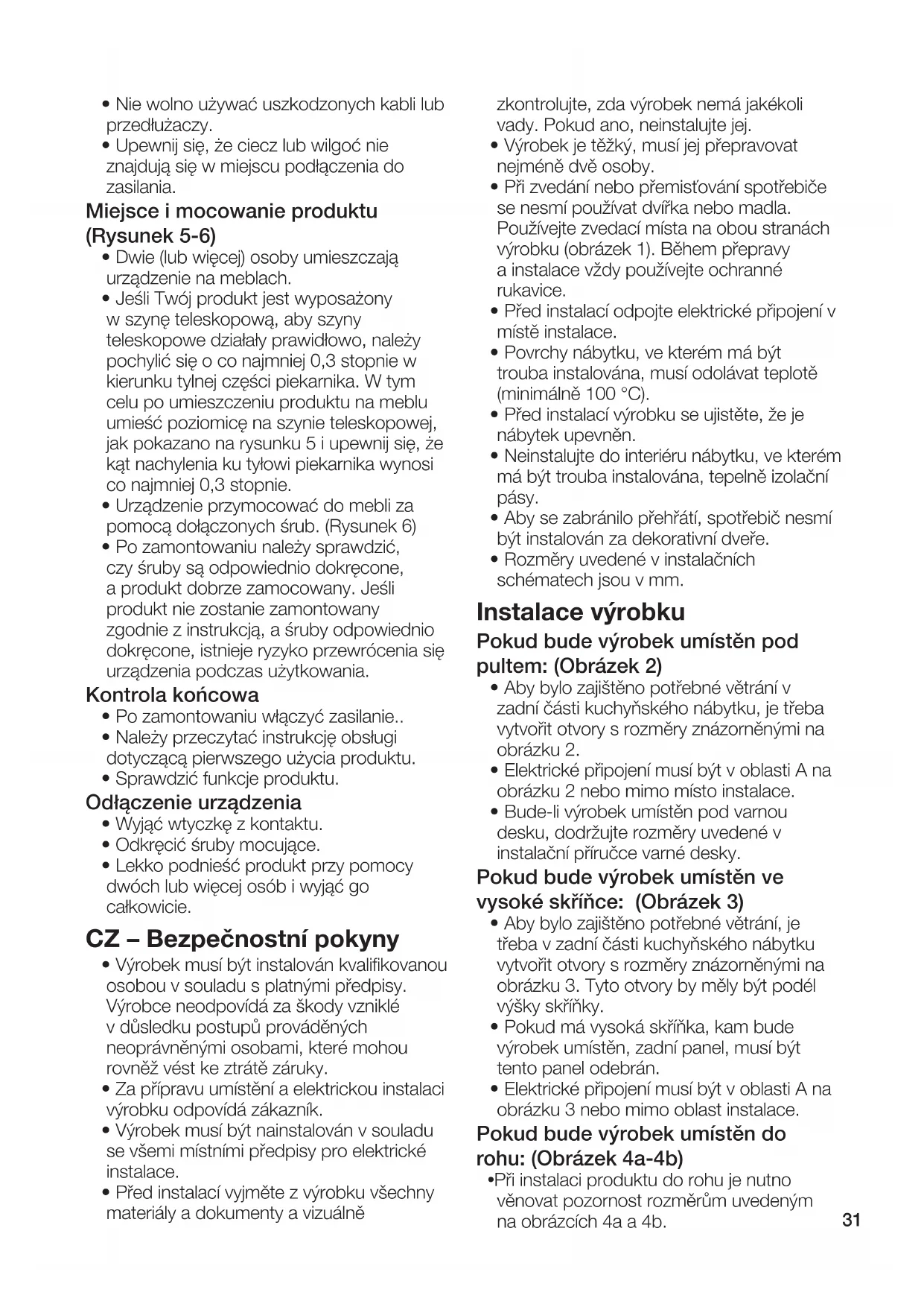 - Zástrčka napájecího kabelu musí být po instalaci snadno přístupná (ale ne nad varnou deskou).