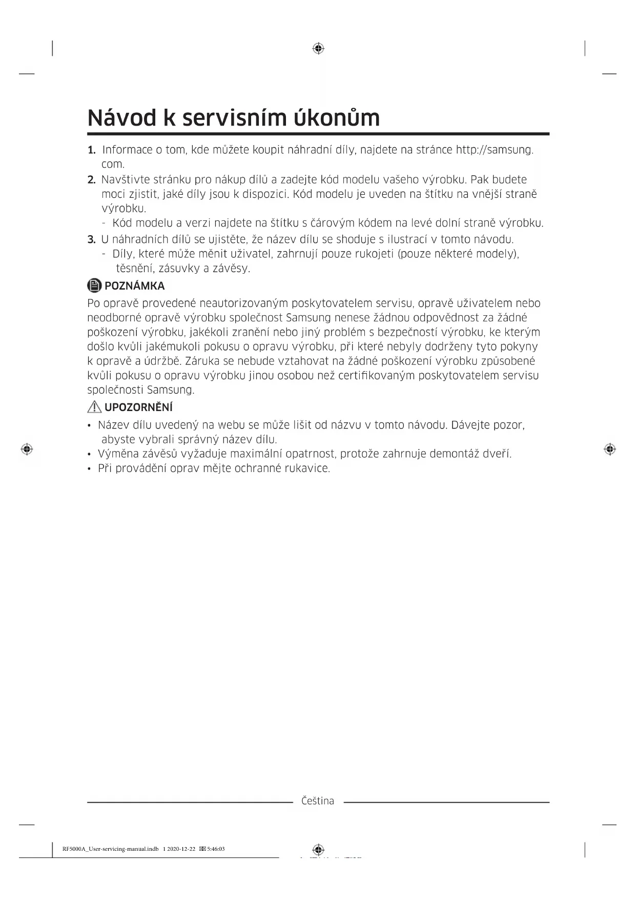 - Při provádění oprav mějte ochranné rukavice. RF5000A_User-servicing-manual.indb 1 2020-12-22 5:46:03Čeština Skutečný vzhled a součásti chladničky se mohou od obrázku v závislosti na modelu a zemi, ve které se nacházíte, lišit.
