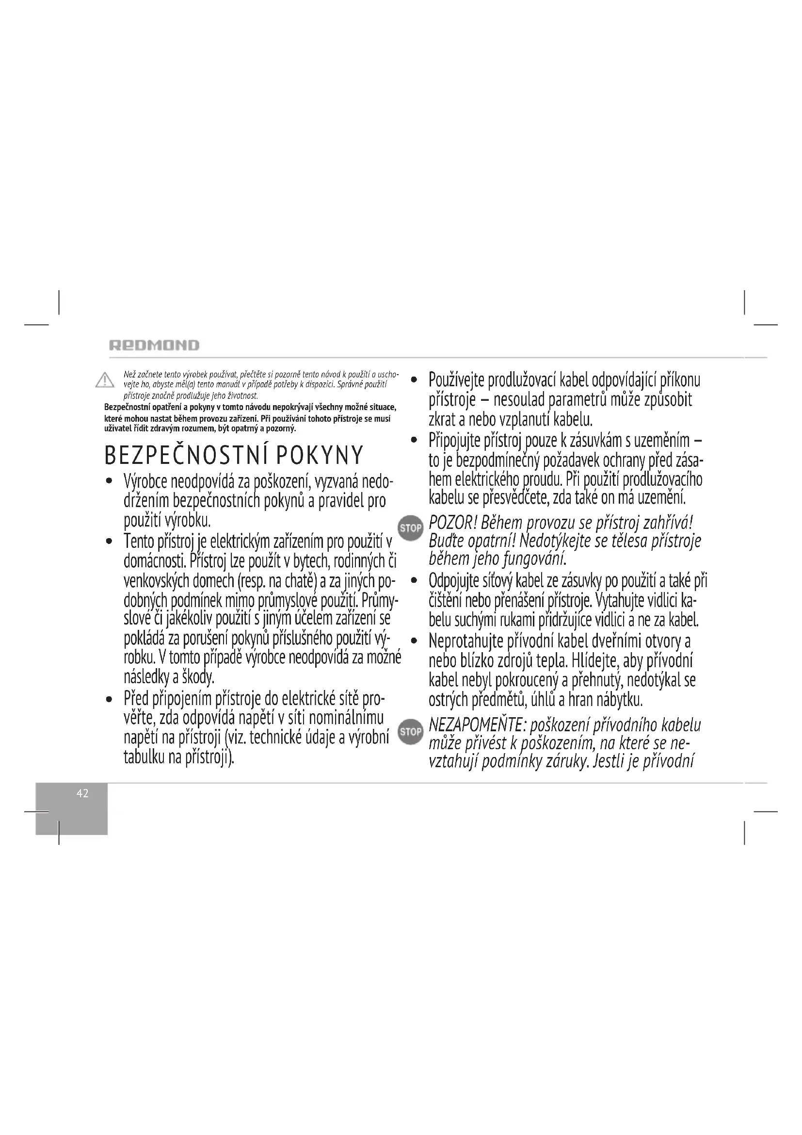 Tělo přístroje podle míry zašpinění otřete vlhkým měkkým hadříkem. JE ZAKÁZÁNO dávat přístroj pod tekoucí vodu, ponořovat do vody, nebo mýt v myčce nádobí. Nepoužívejte abrazivní čisticí li prostředky a chemicky agresivní látky a houbičky s tvrdým povlakem. UPOZORNĚNÍ! Kovový ltr, džbán, víko ltru, víko přístroje a pracovní část myjte pod tekoucí teplou vodou po každém použití. Můžete použít jemný čistící prostředek. Kovovou desku na ohřívání čistěte podle míry zašpinění. Odnímatelný kovový ltr je spotřební materiál. Ověřit dostupnost a možnost jeho získání je možné na stránce www.redmond.company nebo v obchodech ociálních prodejců. Při čištění pracovní části dbejte čistotu těsnící gumy, která se nachází na místě, přes které lijete kávu. Pokud se poškodí nebo ztratí, přístroj nebude před rozlitím kávy ochráněn. Doprava a Skladování Před uložením a opětovným použitím přístroj očistěte a vytřete všechny části zařízení dosucha. Přístroj skladujte na suchém a větraném místě, chraňte ho před zdroji tepla a přímým slunečním zářením. Během přepravy a skladování je zakázáno vystavovat přístroj mechanickému namáhá- ní, které by mohlo vést k poškození zařízení a / nebo porušení celistvosti obalu. Obal od přístroje je třeba chránit před vodou a jinými kapalinami. I V. PŘED NÁVŠTĚVOU SERVISNÍHO CENTRA Nesprávnost Možná příčina Způsob odstranění Voda neprotéká V nádobě není voda Naplňte nádobu vodou Po posledním používání přístroj nebyl dostatečně vyčištěn Očistěte přístroj na základě postupu doporučeného čištění přístroje v části Péče o přístroj Přístroj je velmi špinavý Používáte příliš umletou kávu Doporučujeme vám použít mle- tou kávu, která je určena pro využití v kávovarech tohoto typu46 Nesprávnost Možná příčina Způsob odstranění Voda neprotéká Káva ve ltru je velmi nacpaná Když dáváte kávu do ltru, ne- dělejte to násilně Voda teče příliš rych-