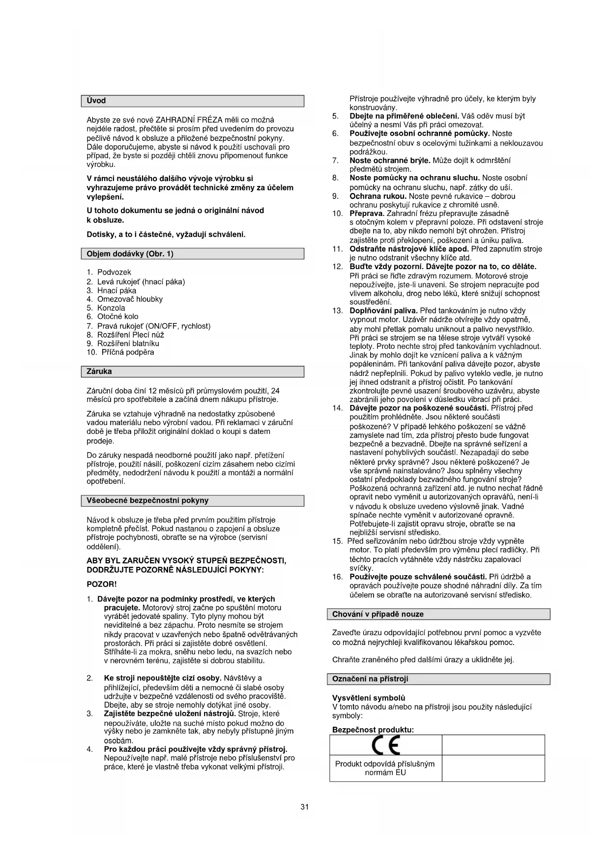 30Úvod Abyste ze své nové ZAHRADNÍ FRÉZA měli co možná nejdéle radost, přečtěte si prosím před uvedením do provozu pečlivě návod k obsluze a přiložené bezpečnostní pokyny. Dále doporučujeme, abyste si návod k použití uschovali pro případ, že byste si později chtěli znovu připomenout funkce výrobku. V rámci neustálého dalšího vývoje výrobku si vyhrazujeme právo provádět technické změny za účelem vylepšení. U tohoto dokumentu se jedná o originální návod k obsluze. Dotisky, a to i částečné, vyžadují schválení. Objem dodávky (Obr. 1)