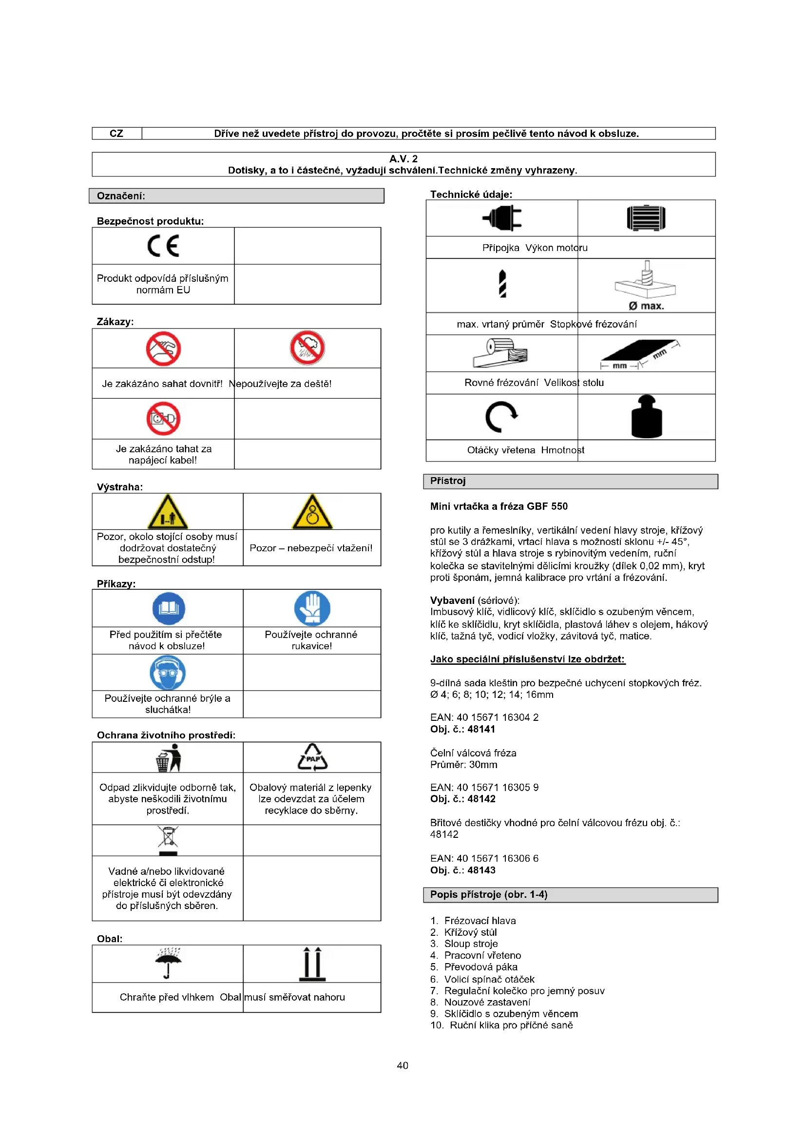 • Stroj nepřetěžujte, pracuje lépe a bezpečněji v uvedeném rozsahu výkonu. Napětí/frekvence: 230 V~50 Hz Typ ochrany (Motor): IP 20 Třída ochrany: I max. výkon: 350 W (P1 S3 50%)* max. vrtaný průměr: 13 mm Rovné frézování: 30 mm Stopkové frézování: 16 mm Morseův kužel ve vřetenu: MK 3 Sklopná hlava stroje: -45°/+45° max. vzdálenost vřeteno-stůl: 220 mm Přečnívání: 167 mm Otáčky vřetena - stupeň1/stupeň2: 0-1100 min