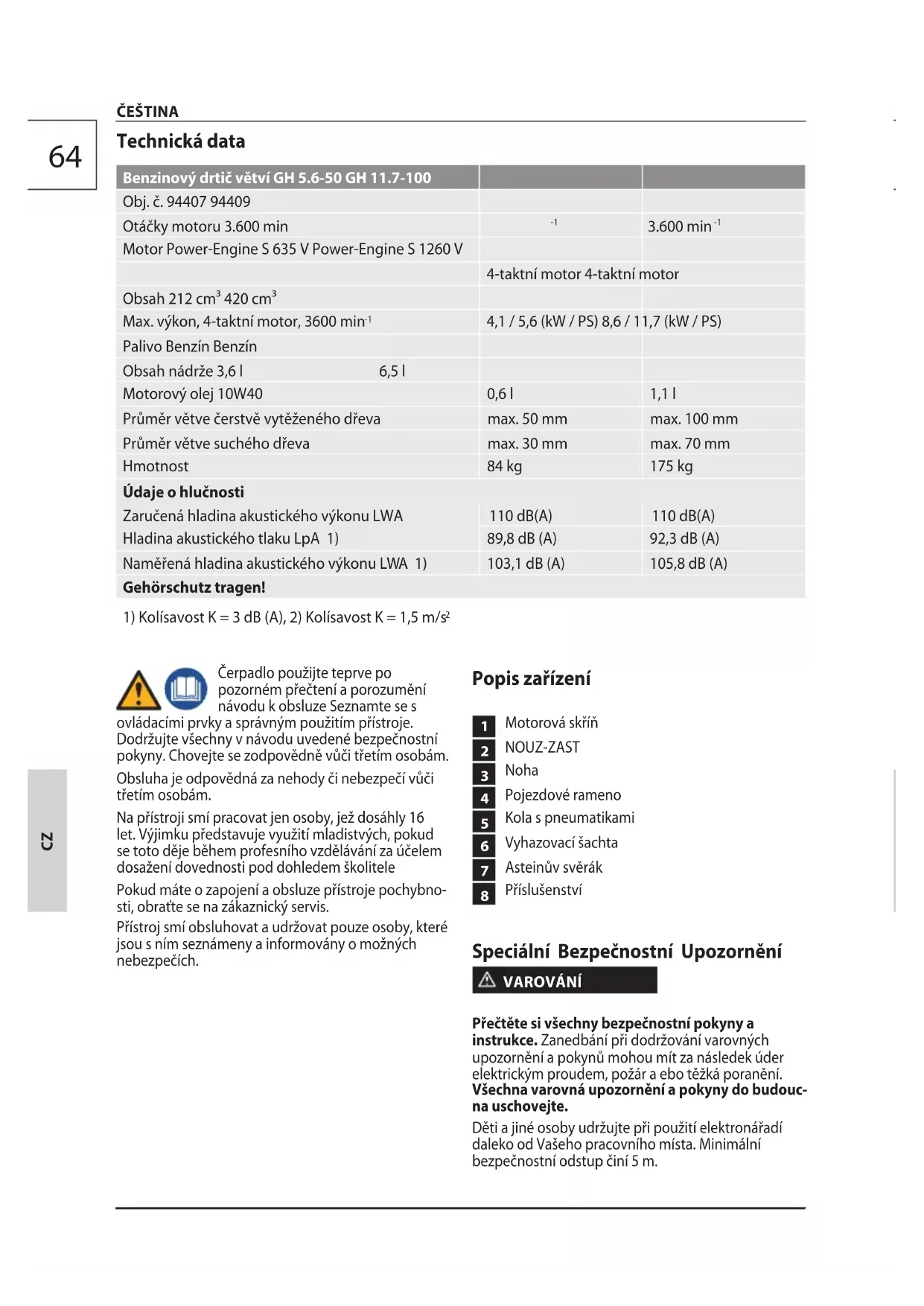 4,1 / 5,6 (kW / PS) 8,6 / 11,7 (kW / PS) Palivo Benzín Benzín Obsah nádrže 3,6 l 6,5 l Motorový olej 10W40 0,6 l 1,1 l Průměr větve čerstvě vytěženého dřeva max. 50 mm max. 100 mm Průměr větve suchého dřeva max. 30 mm max. 70 mm Hmotnost 84 kg 175 kg Údaje o hlučnosti Zaručená hladina akustického výkonu LWA 110 dB(A) 110 dB(A) Hladina akustického tlaku LpA 1) 89,8 dB (A) 92,3 dB (A) Naměřená hladina akustického výkonu LWA 1) 103,1 dB (A) 105,8 dB (A) Gehörschutz tragen!