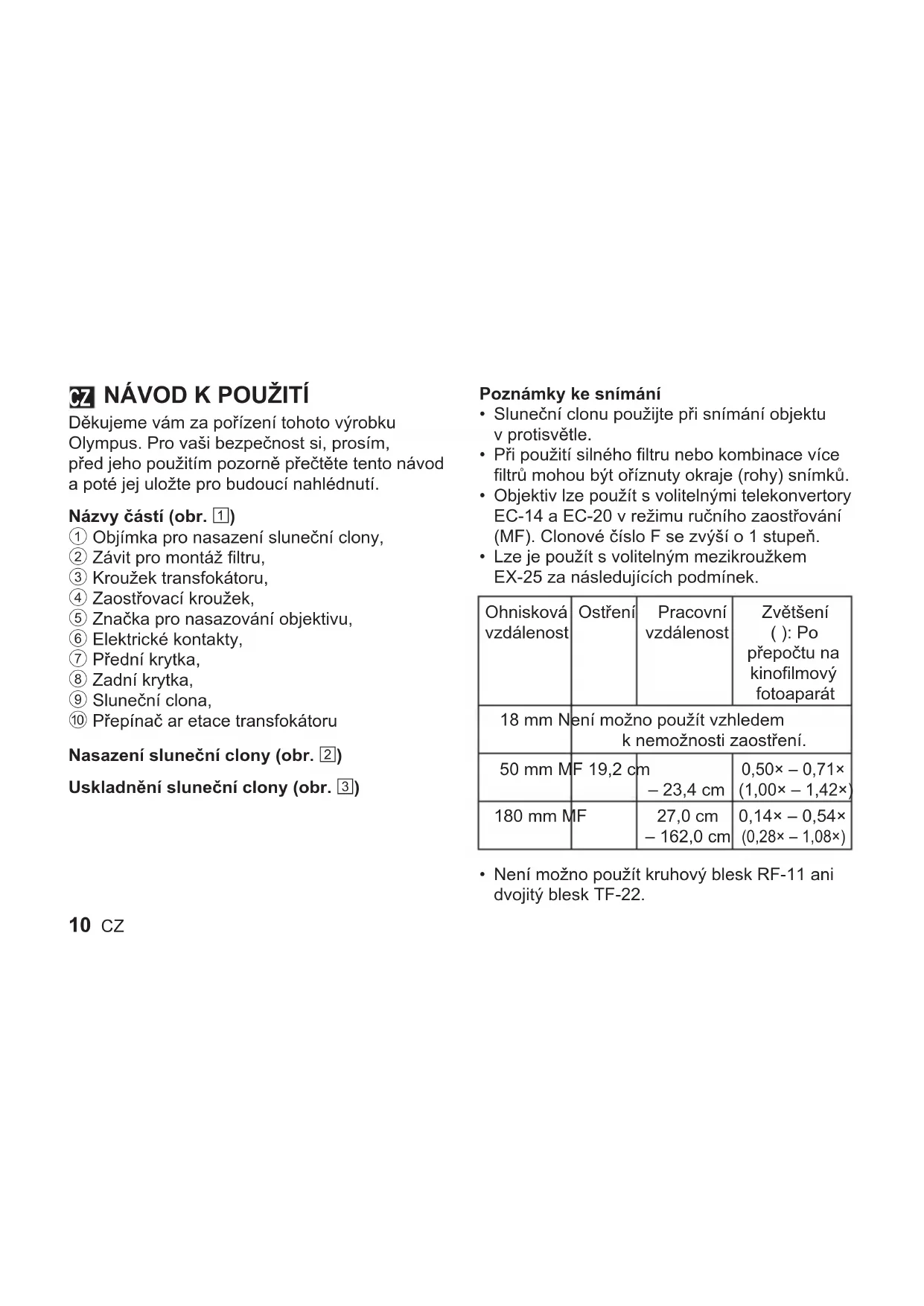 Děkujeme vám za pořízení tohoto výrobku Olympus. Pro vaši bezpečnost si, prosím, před jeho použitím pozorně přečtěte tento návod a poté jej uložte pro budoucí nahlédnutí. Názvy částí (obr. 1) 1 Objímka pro nasazení sluneční clony, 2 Závit pro montáž filtru, 3 Kroužek transfokátoru, 4 Zaostřovací kroužek, 5 Značka pro nasazování objektivu, 6 Elektrické kontakty, 7 Přední krytka, 8 Zadní krytka, 9 Sluneční clona, 0 Přepínač ar etace transfokátoru Nasazení sluneční clony (obr. 2) Uskladnění sluneční clony (obr. 3) Poznámky ke snímání Sluneční clonu použijte při snímání objektu v protisvětle. Při použití silného filtru nebo kombinace více filtrů mohou být oříznuty okraje (rohy) snímků. Objektiv lze použít s volitelnými telekonvertory EC-14 a EC-20 v režimu ručního zaostřování (MF). Clonové číslo F se zvýší o 1 stupeň. Lze je použít s volitelným mezikroužkem EX-25 za následujících podmínek. Ohnisková vzdálenost Ostření Pracovní vzdálenost Zvětšení ( ): Po přepočtu na kinofilmový fotoaparát 18 mm Není možno použít vzhledem k nemožnosti zaostření. 50 mm MF 19,2 cm – 23,4 cm 0,50× – 0,71× (1,00× – 1,42×) 180 mm MF 27,0 cm – 162,0 cm 0,14× – 0,54× (0,28× – 1,08×) Není možno použít kruhový blesk RF-11 ani dvojitý blesk TF-22.