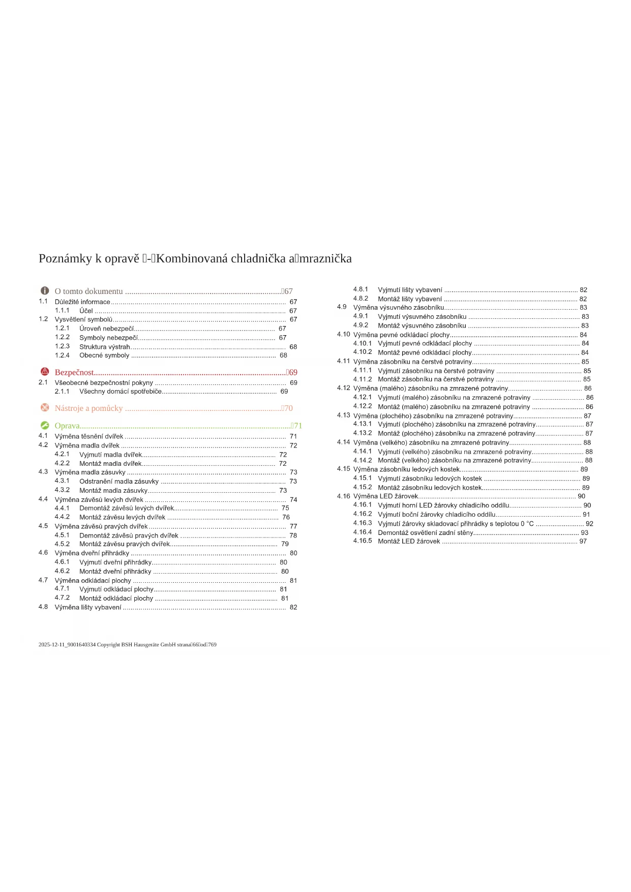 V tomto dokumentu jsou použity následující obecné symboly: Obecný symbol Význam Uvedení zvláštního tipu (text nebo grafické vyjádření) Uvedení jednoduchého tipu (pouze text) Uvedení odkazu k videonávodu Obecný symbol Význam Uvedení požadovaných nástrojů Uvedení požadovaných podmínek Uvedení podmínky (když, pak atd.) Uvedení výsledku Start Uvedení klávesy nebo tlačítka [00123456] Uvedení čísla materiálu Status Uvedení zobrazeného textu / okna (na ukazateli spotřebiče) Tabulka3: Obecné symboly O tomto dokumentu 2025-12-11_9001640334 Copyright BSH Hausgeräte GmbH strana68od769Bezpečnost