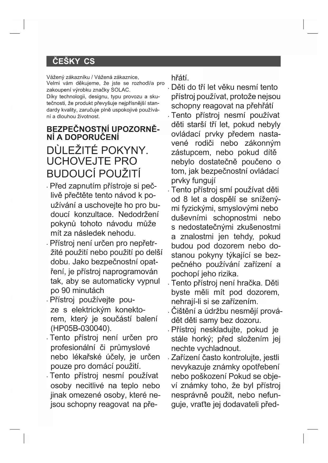 - Děti do tří let věku nesmí tento přístroj používat, protože nejsou schopny reagovat na přehřátí