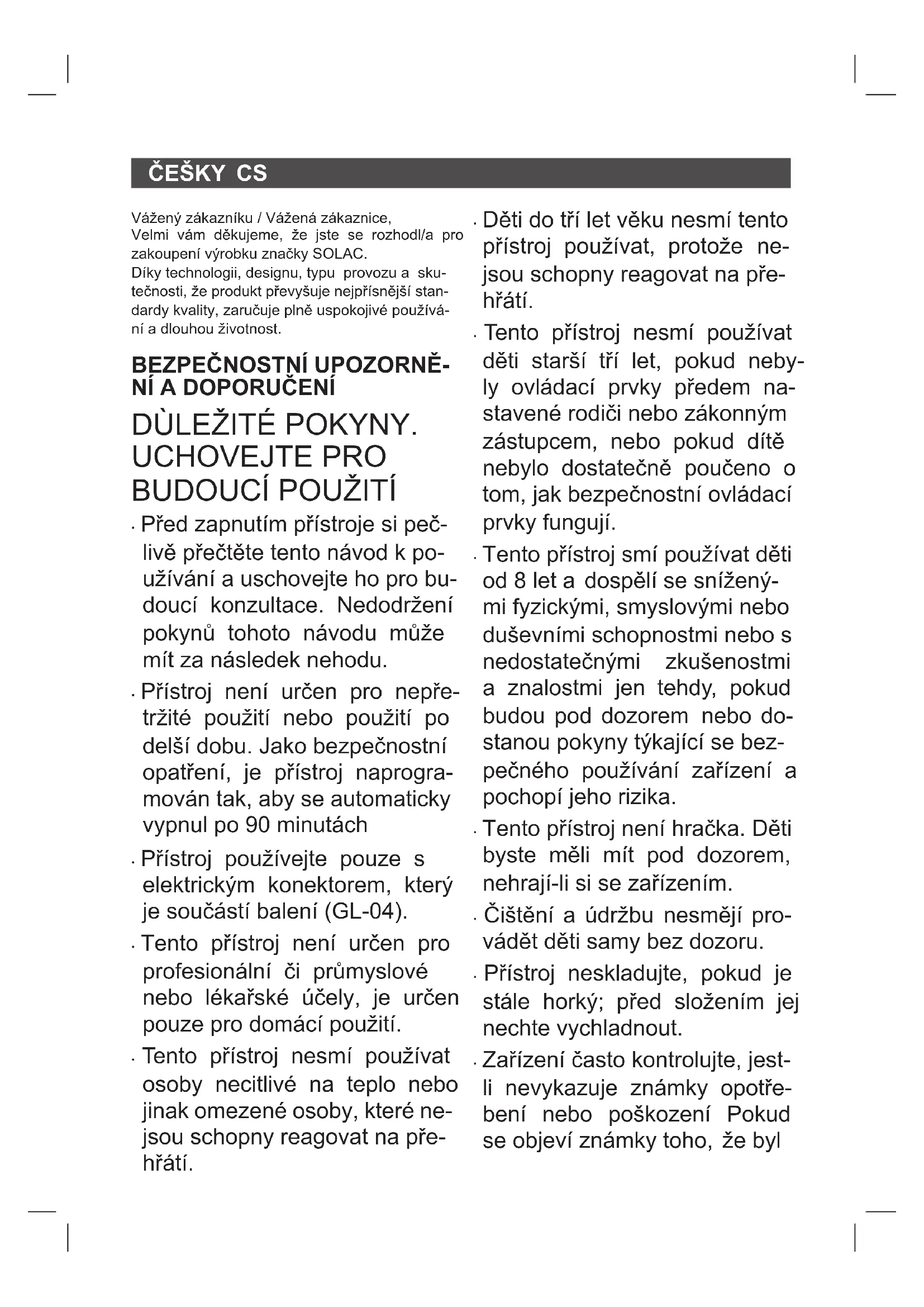 - Produkt neobsahuje koncentrace látek, které by mohly být považovány za škodlivé pro ži- votní prostředí. Tento symbol znamená, že po skončení životnosti přístroje je třeba tento zanést na autorizované místo pro oddělený sběr a re- cyklaci odpadních elektrických a elektronických zařízení (OEEZ). Tento přístroj je v souladu se směrnicí 2014/35/ EU o nízkém napětí, směrnicí 2014/30/EU o elektromagnetické kompatibilitě, směrnicí 2011/65/EU o omezení používání některých ne- bezpečných látek v elektrických a elektronických zařízeních a směrnicí 2009/125/ES o požadav- cích na ekodesign výrobků spojených se spotře- bou energie.POLSKI PL Szanowny Kliencie, Serdecznie dziękujemy za zdecydowanie się na zakup sprzętu gospodarstwa domowego marki SOLAC. Jego technologia, forma i funkcjonalność, jak również fakt, że spełnia on wszelkie normy jako- ści, dostarczy Państwu pełnej satysfakcji przez długi czas.