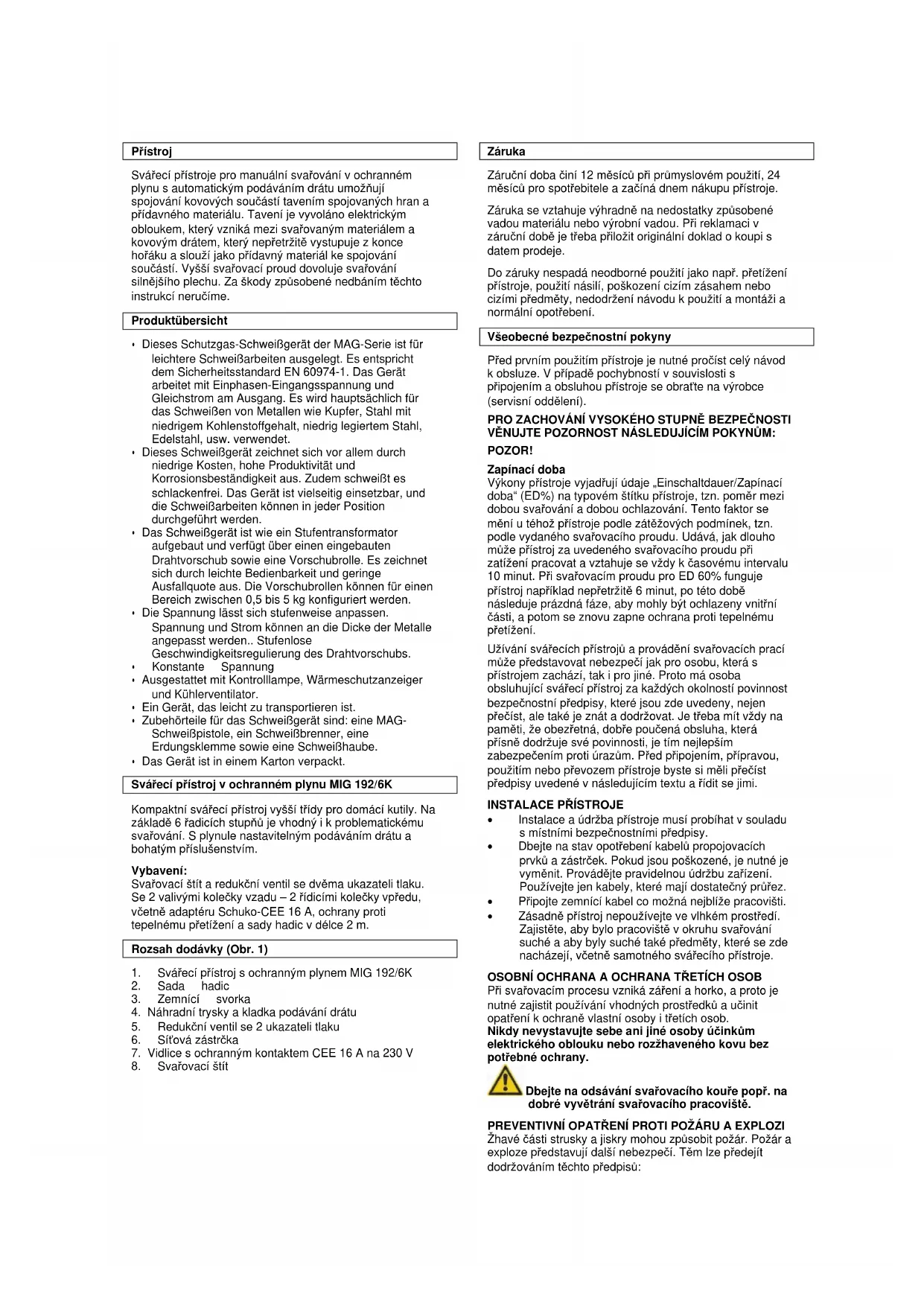 Záruka Záruční doba činí 12 měsíců při průmyslovém použití, 24 měsíců pro spotřebitele a začíná dnem nákupu přístroje. Záruka se vztahuje výhradně na nedostatky způsobené vadou materiálu nebo výrobní vadou. Při reklamaci v záruční době je třeba přiložit originální doklad o koupi s datem prodeje. Do záruky nespadá neodborné použití jako např. přetížení přístroje, použití násilí, poškození cizím zásahem nebo cizími předměty, nedodržení návodu k použití a montáži a normální opotřebení. Všeobecné bezpečnostní pokyny Před prvním použitím přístroje je nutné pročíst celý návod k obsluze. V případě pochybností v souvislosti s připojením a obsluhou přístroje se obraťte na výrobce (servisní oddělení). PRO ZACHOVÁNÍ VYSOKÉHO STUPNĚ BEZPEČNOSTI VĚNUJTE POZORNOST NÁSLEDUJÍCÍM POKYNŮM: POZOR! Zapínací doba Výkony přístroje vyjadřují údaje „Einschaltdauer/Zapínací doba“ (ED%) na typovém štítku přístroje, tzn. poměr mezi dobou svařování a dobou ochlazování. Tento faktor se mění u téhož přístroje podle zátěžových podmínek, tzn. podle vydaného svařovacího proudu. Udává, jak dlouho může přístroj za uvedeného svařovacího proudu při zatížení pracovat a vztahuje se vždy k časovému intervalu 10 minut. Při svařovacím proudu pro ED 60% funguje přístroj například nepřetržitě 6 minut, po této době následuje prázdná fáze, aby mohly být ochlazeny vnitřní části, a potom se znovu zapne ochrana proti tepelnému přetížení. Užívání svářecích přístrojů a provádění svařovacích prací může představovat nebezpečí jak pro osobu, která s přístrojem zachází, tak i pro jiné. Proto má osoba obsluhující svářecí přístroj za každých okolností povinnost bezpečnostní předpisy, které jsou zde uvedeny, nejen přečíst, ale také je znát a dodržovat. Je třeba mít vždy na paměti, že obezřetná, dobře poučená obsluha, která přísně dodržuje své povinnosti, je tím nejlepším zabezpečením proti úrazům. Před připojením, přípravou, použitím nebo převozem přístroje byste si měli přečíst předpisy uvedené v následujícím textu a řídit se jimi.