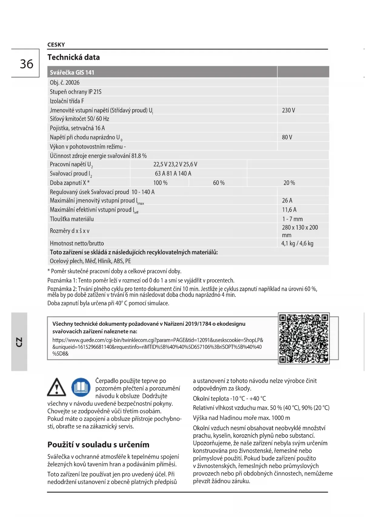 - Poměr skutečné pracovní doby a celkové pracovní doby. Poznámka 1: Tento poměr leží v rozmezí od 0 do 1 a smí se vyjádřit v procentech. Poznámka 2: Trvání plného cyklu pro tento dokument činí 10min. Jestliže je cyklus zapnutí například na úrovni 60%, měla by po době zatížení v trvání 6 min následovat doba chodu naprázdno 4 min. Doba zapnutí byla určena při 40° C pomocí simulace. Všechny technické dokumenty požadované v Nařízení 2019/1784 o ekodesignu svařovacích zařízení naleznete na: https://www.guede.com/cgi-bin/twinklecom.cgi?param=PAGE&tid=12091&useskscookie=ShopLP& &uniqueid=1615296681140&requestinfo=riMTID%5B%40%40%5D657106%3BriSOPT%5B%40%40 %5D8& a ustanovení z tohoto návodu nelze výrobce činit odpovědným za škody. Okolní teplota -10 °C - +40 °C Relativní vlhkost vzduchu max. 50 % (40 °C), 90% (20 °C) Výška nad hladinou moře max. 1000 m Okolní vzduch nesmí obsahovat neobvyklé množství prachu, kyselin, korozních plynů nebo substancí. Upozorňujeme, že naše zařízení nebyla svým určením konstruována pro živnostenské, řemeslné nebo průmyslové použití. Pokud bude zařízení použito v živnostenských, řemeslných nebo průmyslových provozech nebo při obdobných činnostech, nemůžeme převzít žádnou záruku.37 Bezpečnostní pokyny POZOR! Úder elektrickým proudem! Existuje riziko úrazu elektrickým proudem! Provoz je povolen jen s ochranným vypínačem proti chybovému proudu (RCD max. chybový proud 30mA). Svářečka má stupeň ochrany IP21 a nesmí být vysta